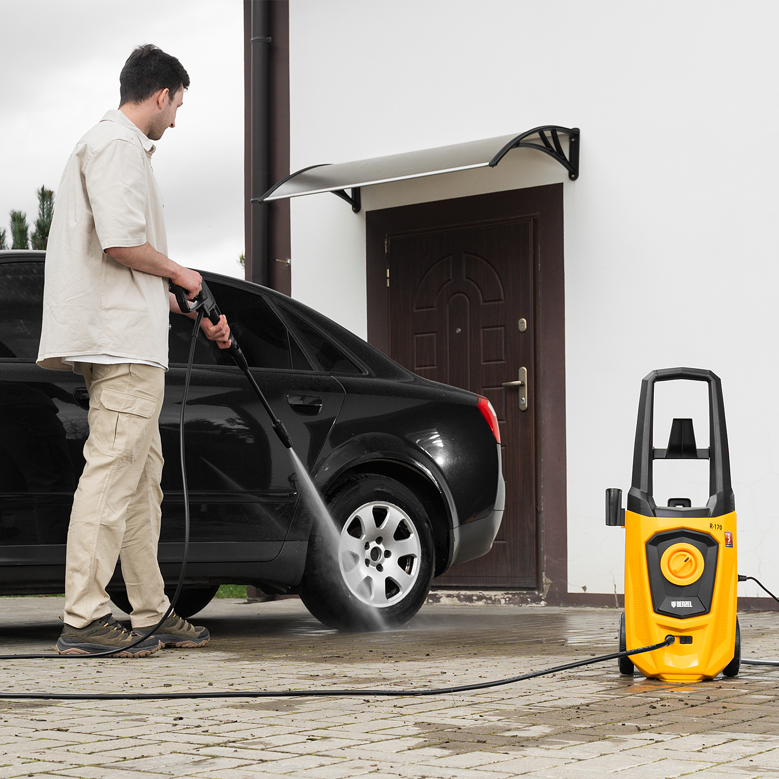 Колесная моечная машина высокого давления Denzel R-170 58228 мощностью 2000 Вт и производительностью 360 л/ч подает струю воды под давлением 170 бар и используется для очищения поверхностей. Позволяет быстро удалить загрязнения с кузова автомобиля, мотоцикла, велосипеда, садового и хозяйственного инвентаря, очистить садовую дорожку и террасу, а также стены и окна строений. Источником воды может служить водопроводная линия, а также любая емкость — машина способна работать в режиме самовсасывания. Мойка пригодится владельцам загородных участков.