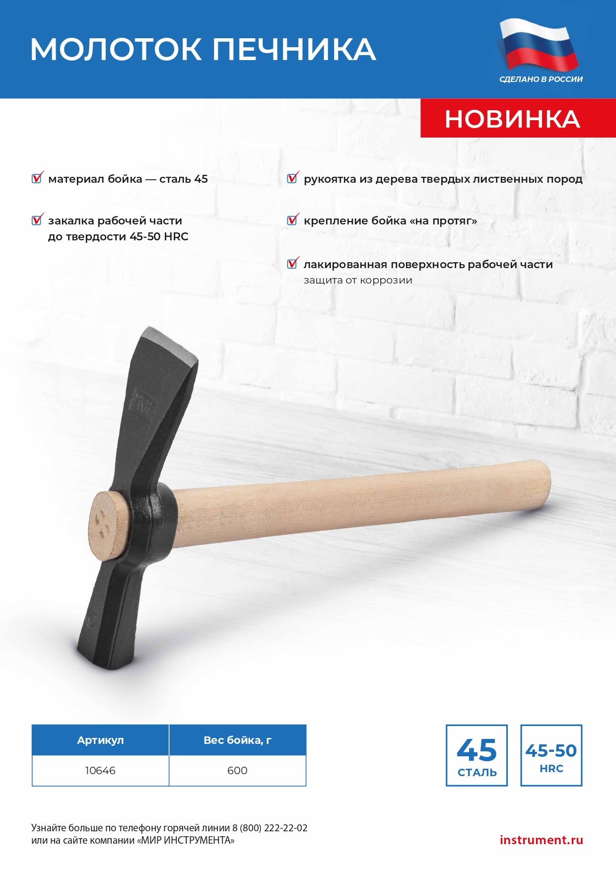 Молоток печника 10646 с деревянной рукояткой, головкой весом 600 г и посадкой бойка на протяг (без клина) — специализированный инструмент для работы с кирпичом и керамическим стеновым камнем. Форма головки обусловлена спецификой области применения — с одной стороны имеется квадратный боек для нанесения ударов, а с другой — плоская лопатка для раскалывания или обтесывания кирпича и камня. Молоток используется в строительном и печном деле.