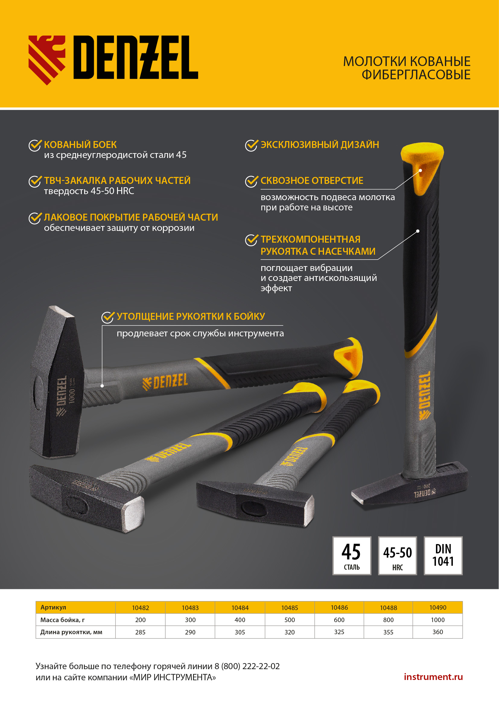 Молоток слесарный кованый Denzel 10490 с квадратным бойком весом 1000 г и трехкомпонентной фибергласовой рукояткой с TPR-покрытием предназначен для работы с металлическими заготовками, забивания гвоздей, штырей, дюбелей и другого крепежа. Рукоятка выполнена в эксклюзивном дизайне. Молоток рекомендован для профессионального и домашнего применения.