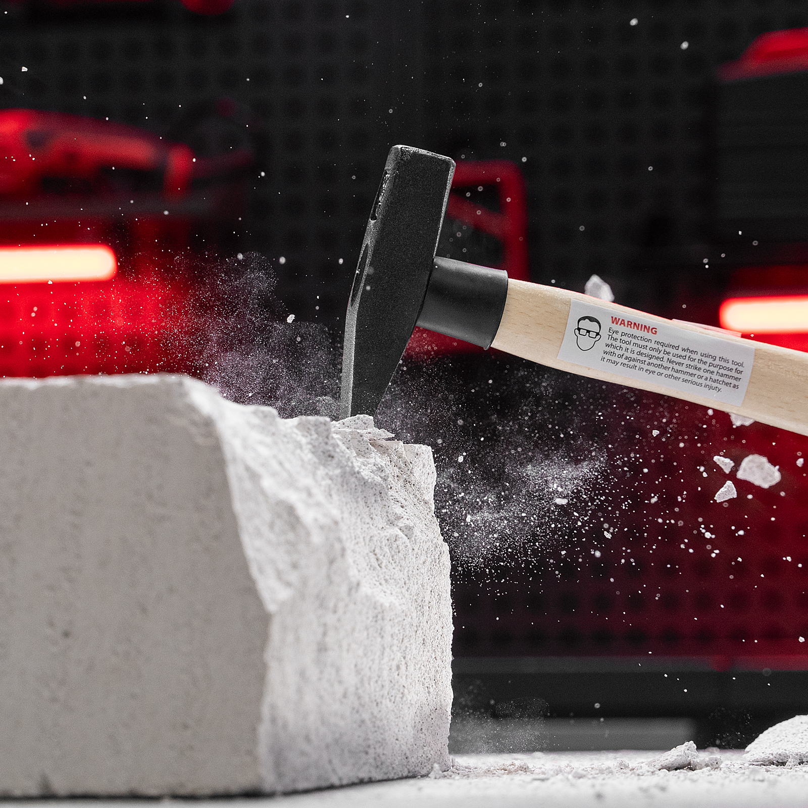 - Надежная конструкция — рукоятка расклинена, головка дополнительно зафиксирована эпоксидным клеем, увеличенная «юбка» в месте всада защищает рукоятку в случае промаха при ударе.