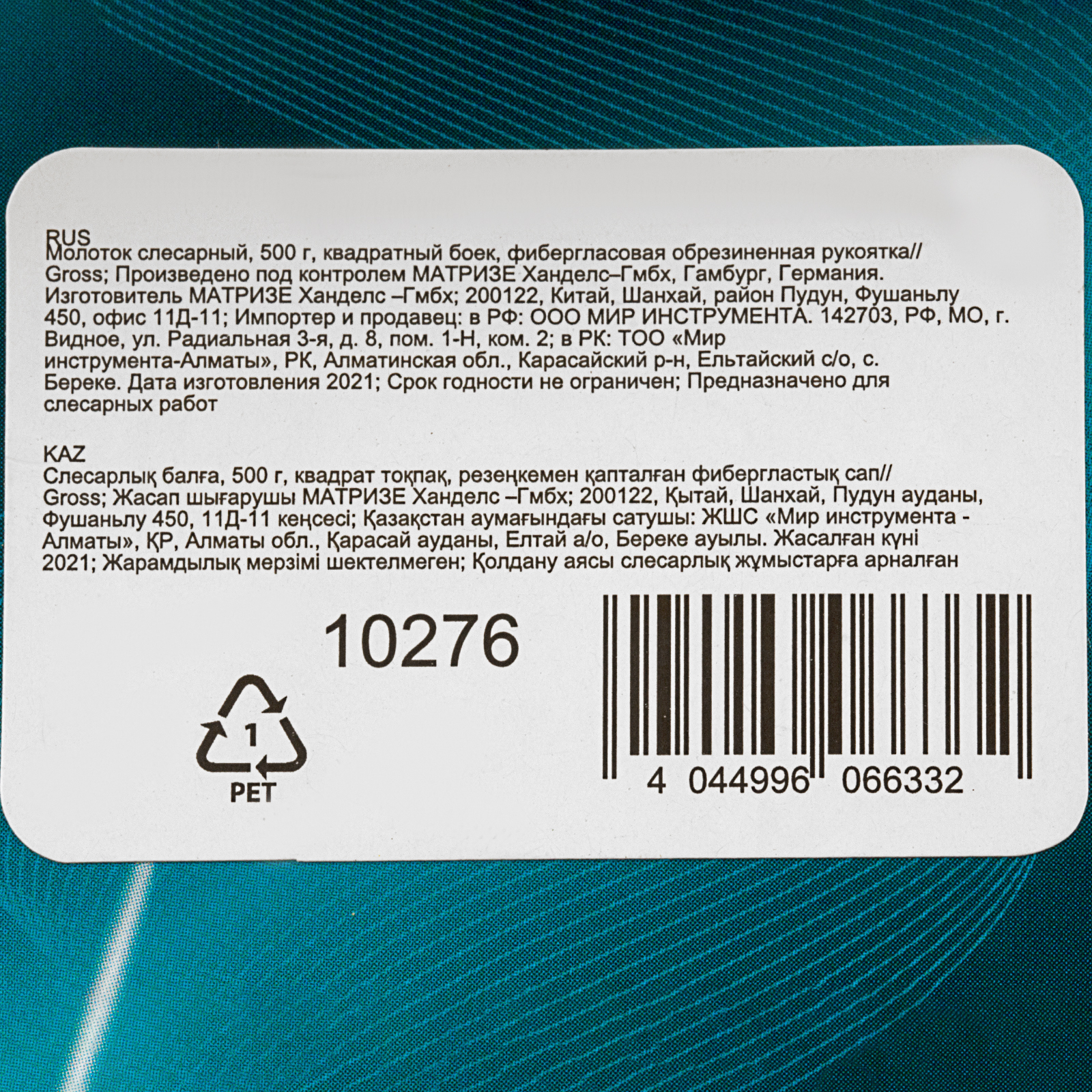 Молоток слесарный, 500 г, квадратный боек, фибергласовая обрезиненная рукоятка Gross в Краснодаре