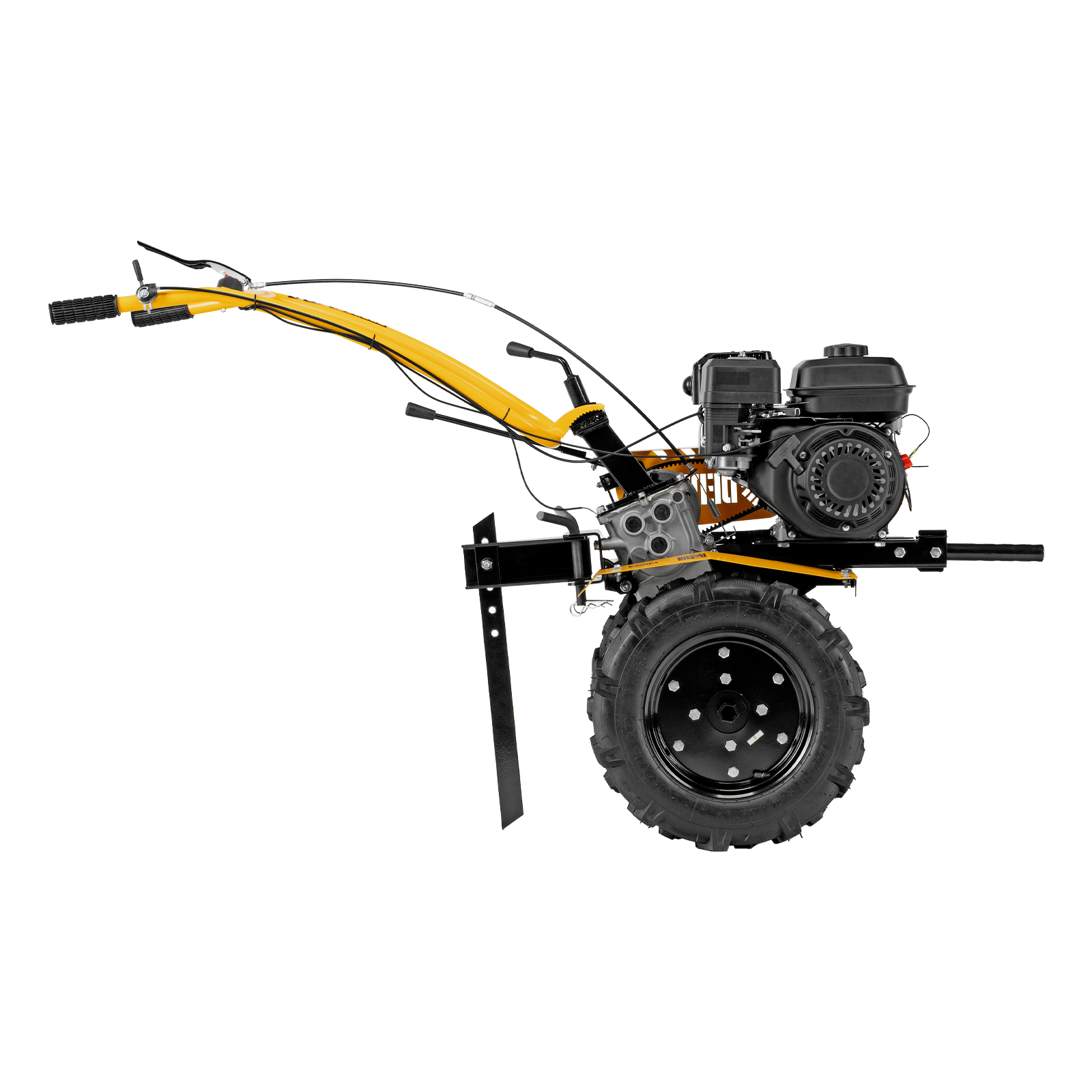 - Эффективная работа — благодаря усиленному шестеренчато-цепному редуктору с алюминиевым корпусом мотоблок успешно справляется даже с плотным, глинистым грунтом.