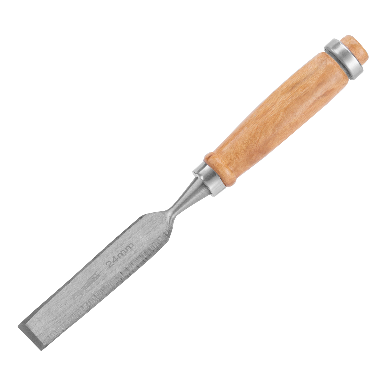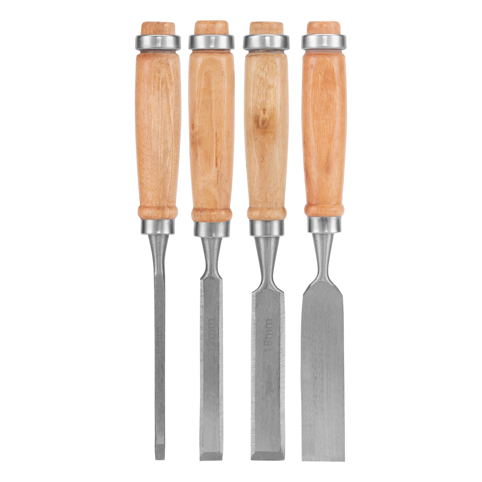Набор плоских долот-стамесок Sparta 242405 размером 6-12-18-24 мм, с деревянными рукоятками, пригодится для выборки и зачистки пазов под врезные замки, снятия фасок, отделения стружки и других столярно-плотницких работ. Ударные стамески легче врезаются в древесину и обеспечивают ровный срез, т.к. по их торцу можно наносить удары киянкой или небольшим молотком.