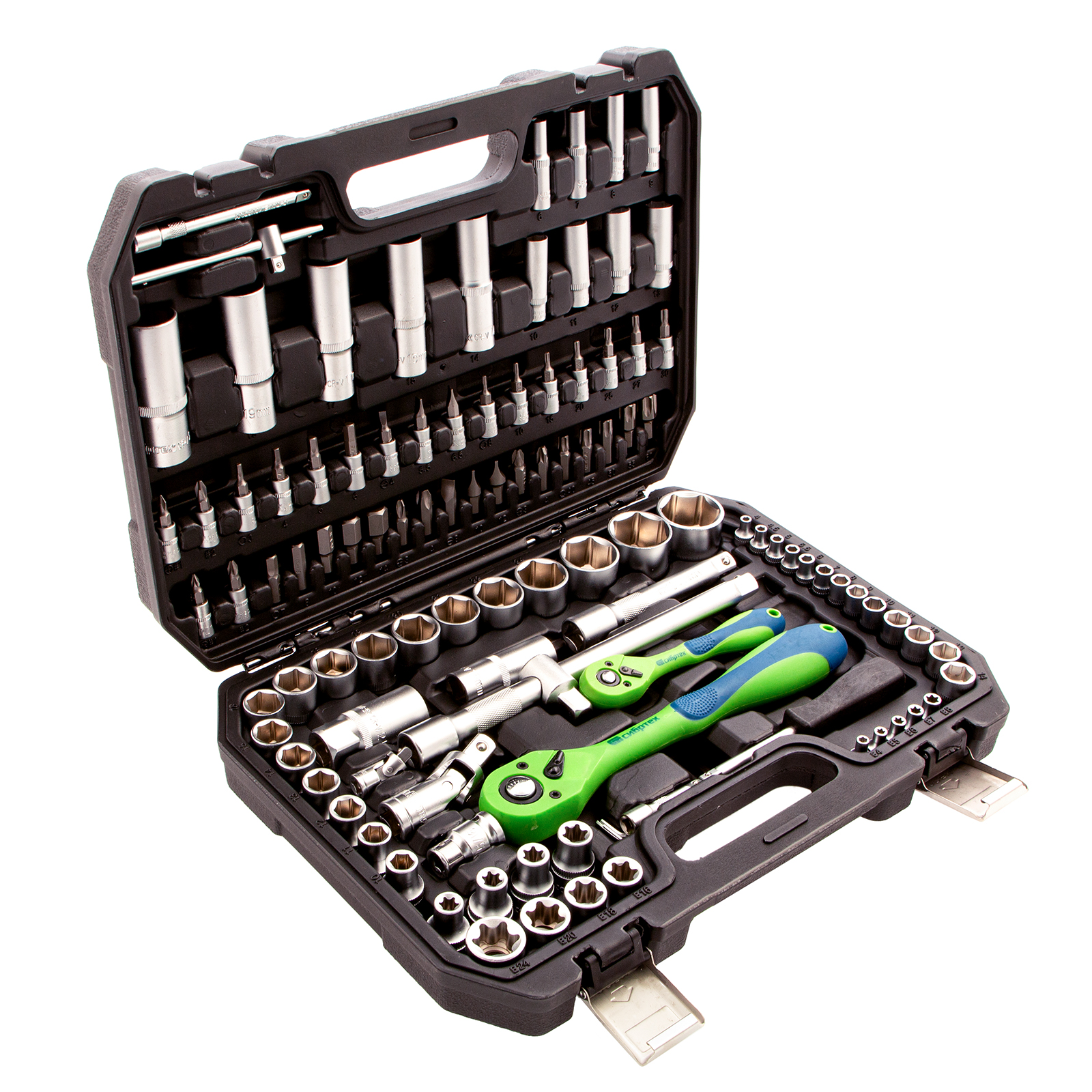 - Прочность и износостойкость — элементы набора изготовлены из хромованадиевой стали, корпус каждого трещоточного ключа имеет защитное покрытие.