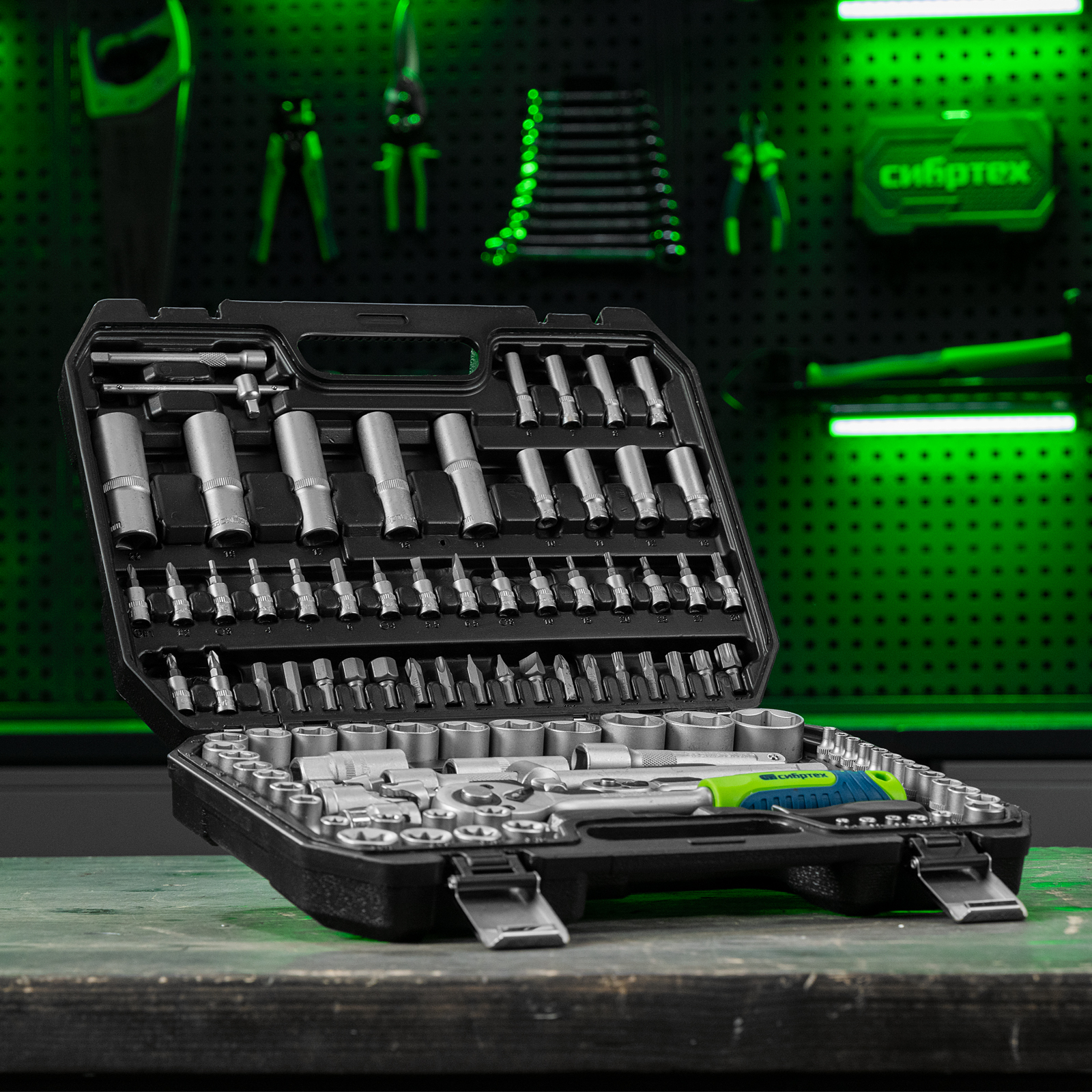 Набор инструментов Сибртех 13389 упакован в пластиковый кейс и состоит из 108 предметов с присоединительным размером 1/2" и 1/4", предназначенных для монтажа и демонтажа резьбового крепежа с разными типами шлицев. В комплект поставки входят карданы, удлинители и переходники, облегчающие работу в труднодоступных местах. Набор используется для ремонта автомобилей, а также полезен в быту.