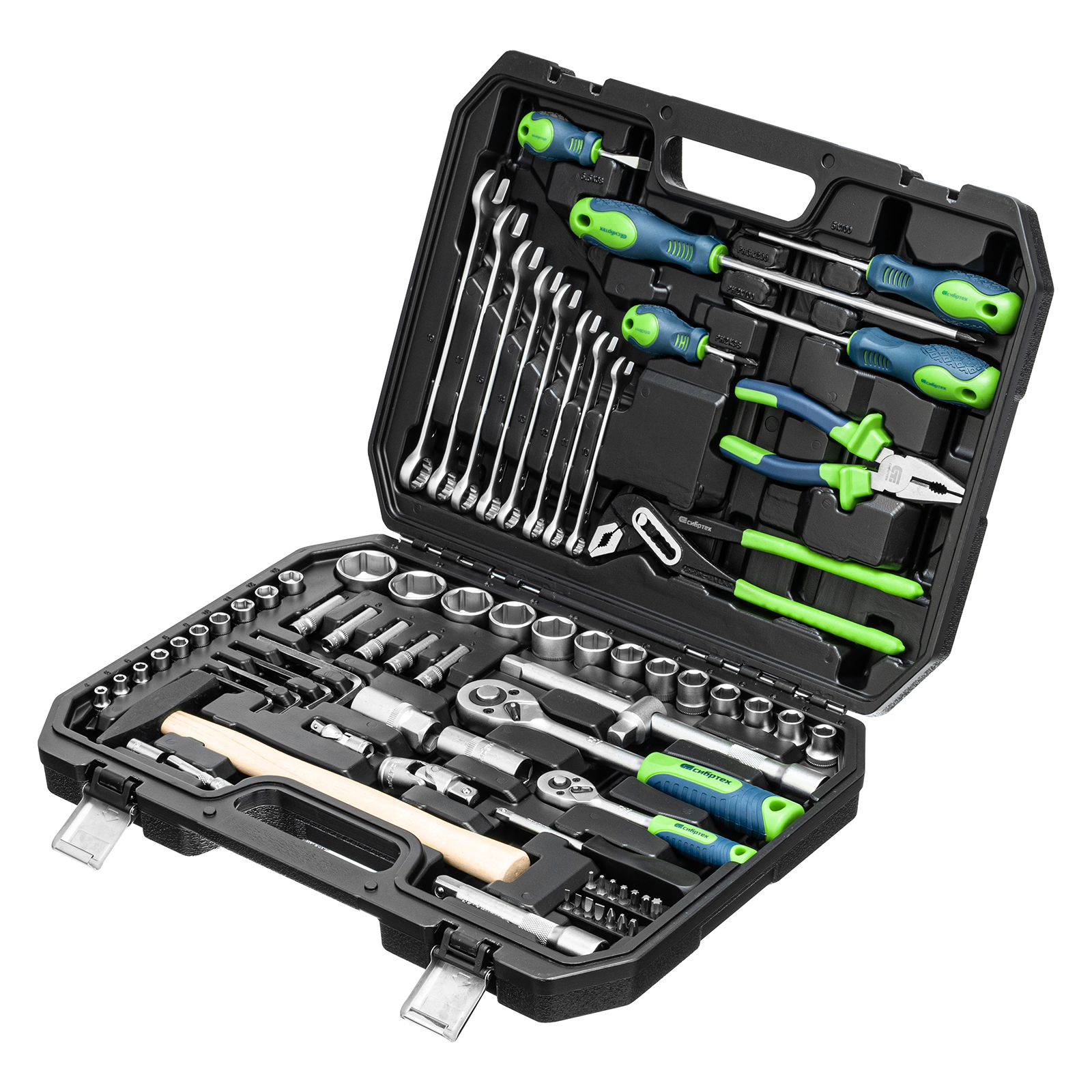 Набор инструментов Сибртех 13394 упакован в пластиковый кейс и состоит из 76 предметов с присоединительным размером 1/2" и 1/4", предназначенных для монтажа и демонтажа резьбового крепежа с разными типами шлицев, а также для ударных и других слесарно-монтажных работ. В комплект поставки входят карданы, удлинители и переходники, облегчающие работу в труднодоступных местах. Набор используется для ремонта автомобилей, а также полезен в быту.
