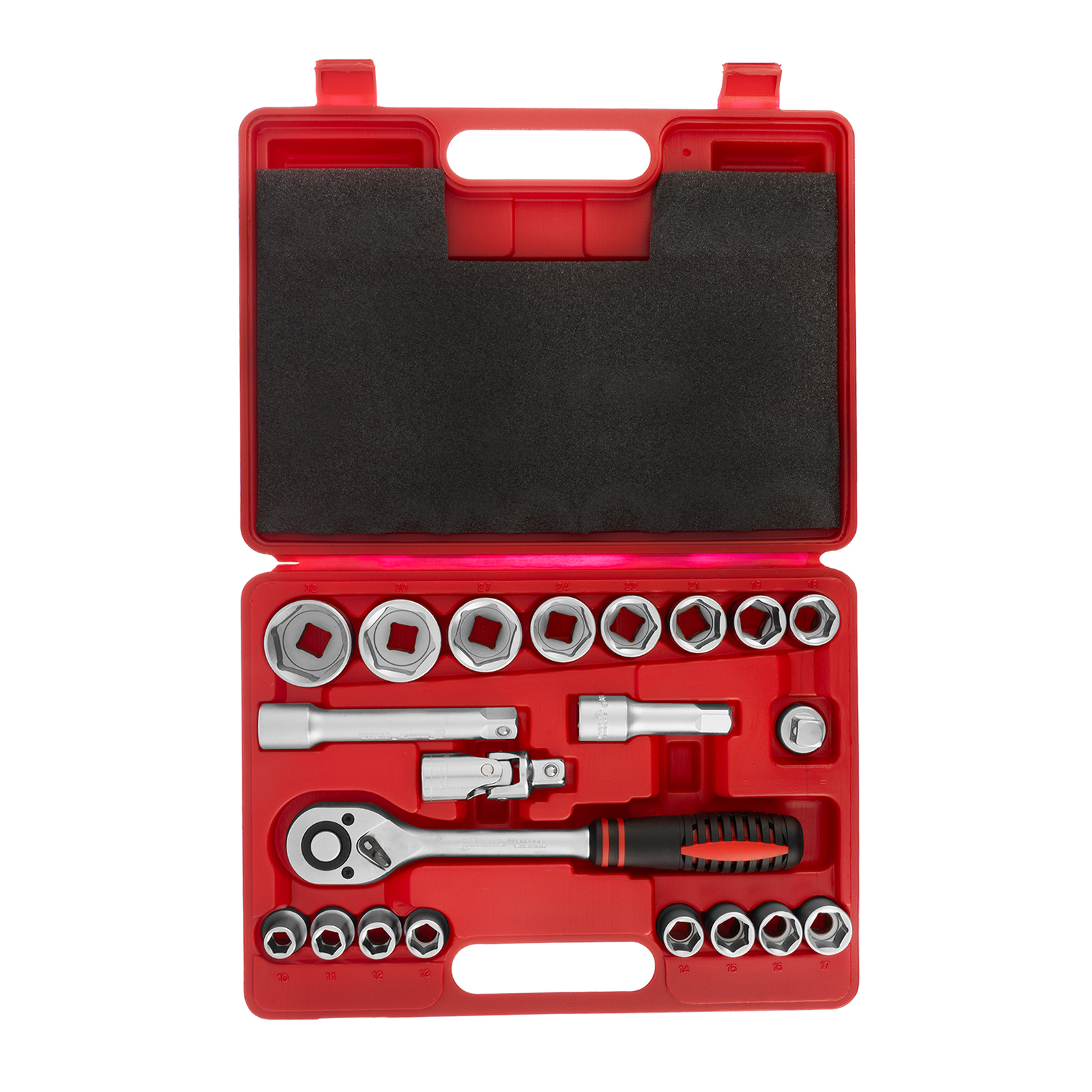 Ключ трещоточный - 1 штКардан - 1 штПереходник - 1 штУдлинители 75, 125 - 2 штГоловки 10, 11, 12, 13, 14, 15, 16, 7, 18, 19, 21, 22, 24, 27, 30, 32 - 16 штКейс - 1 штТрещотка - 1 шт |