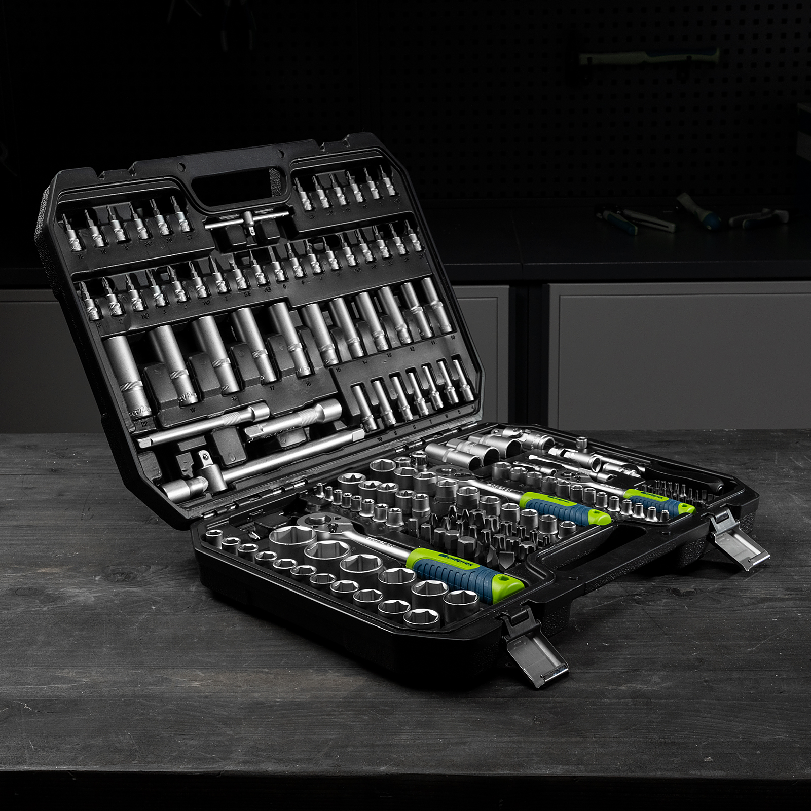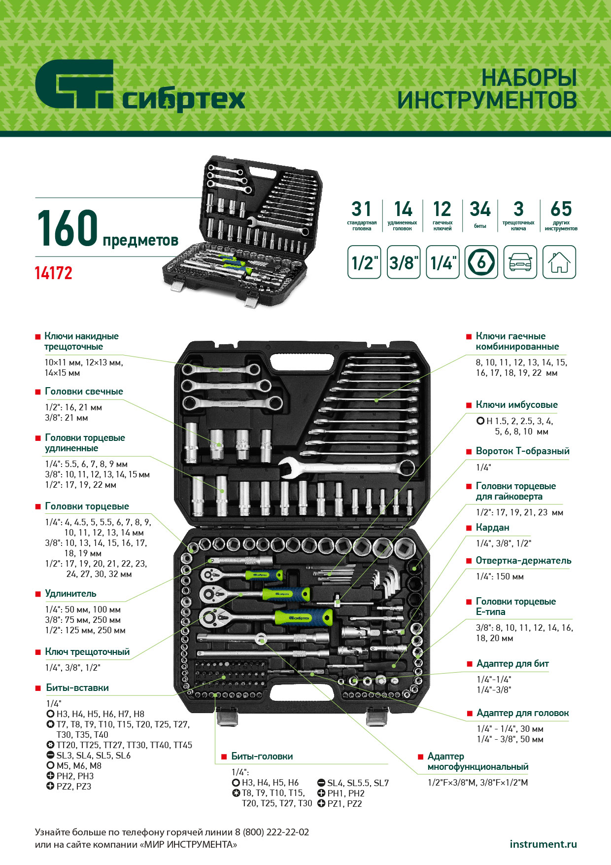 Набор инструментов Сибртех 14171 упакован в пластиковый кейс и состоит из 172 предметов с присоединительным размером 1/2", 3/8", 1/4", предназначенных для монтажа и демонтажа резьбового крепежа с разными типами шлицев. В комплект поставки входят карданы, удлинители и переходники, облегчающие работу в труднодоступных местах. Набор используется для ремонта автомобилей, а также будет полезен в быту.