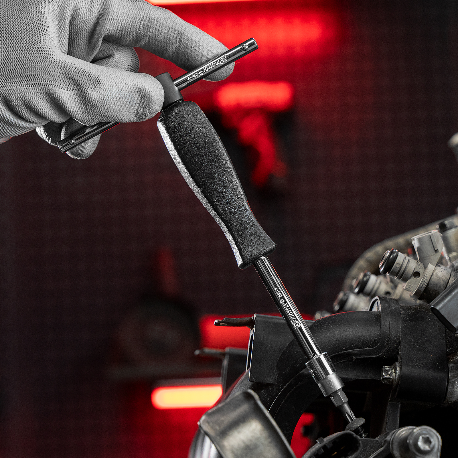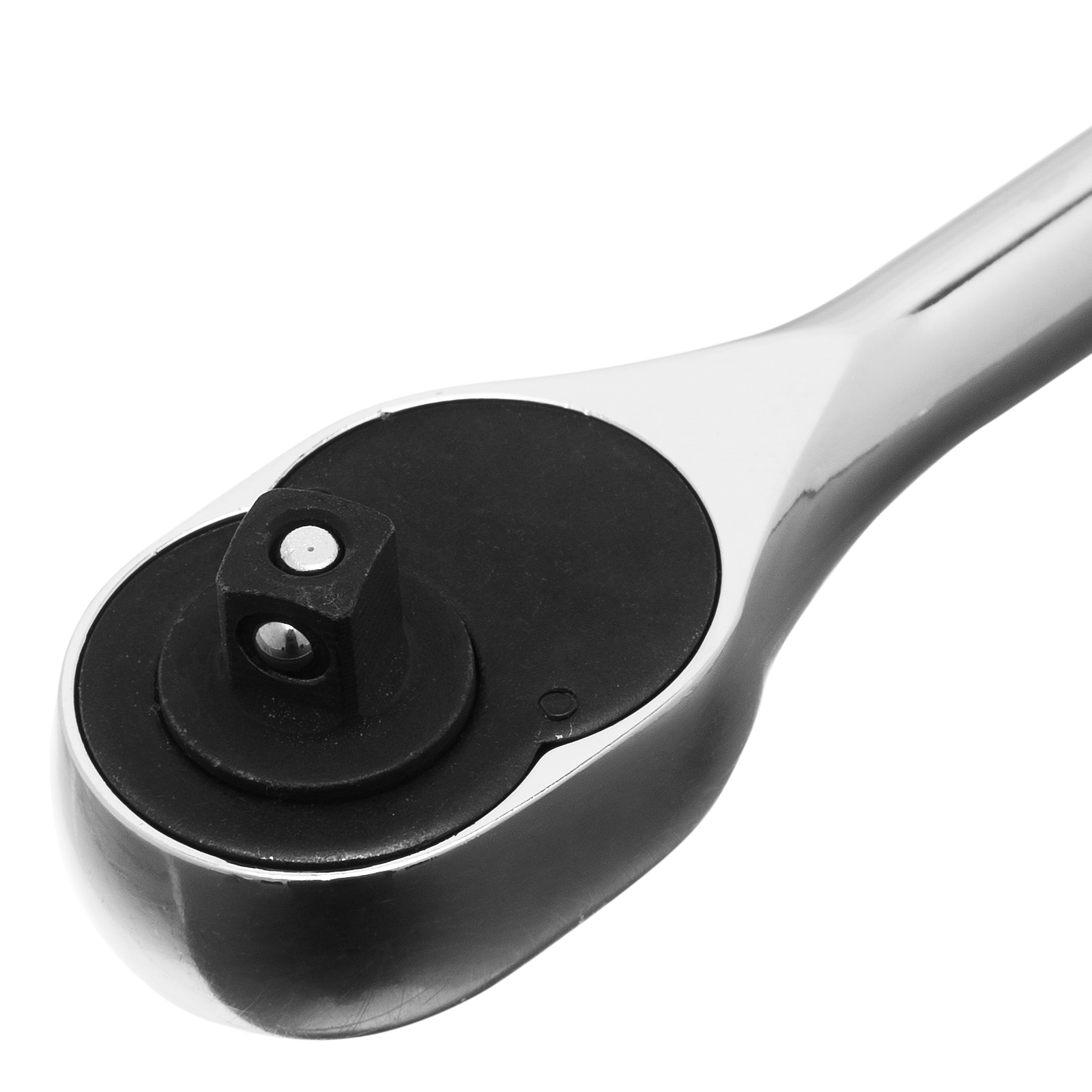 - Быстрая замена головок — кнопка сброса на трещотке позволяет мгновенно снять насадку.