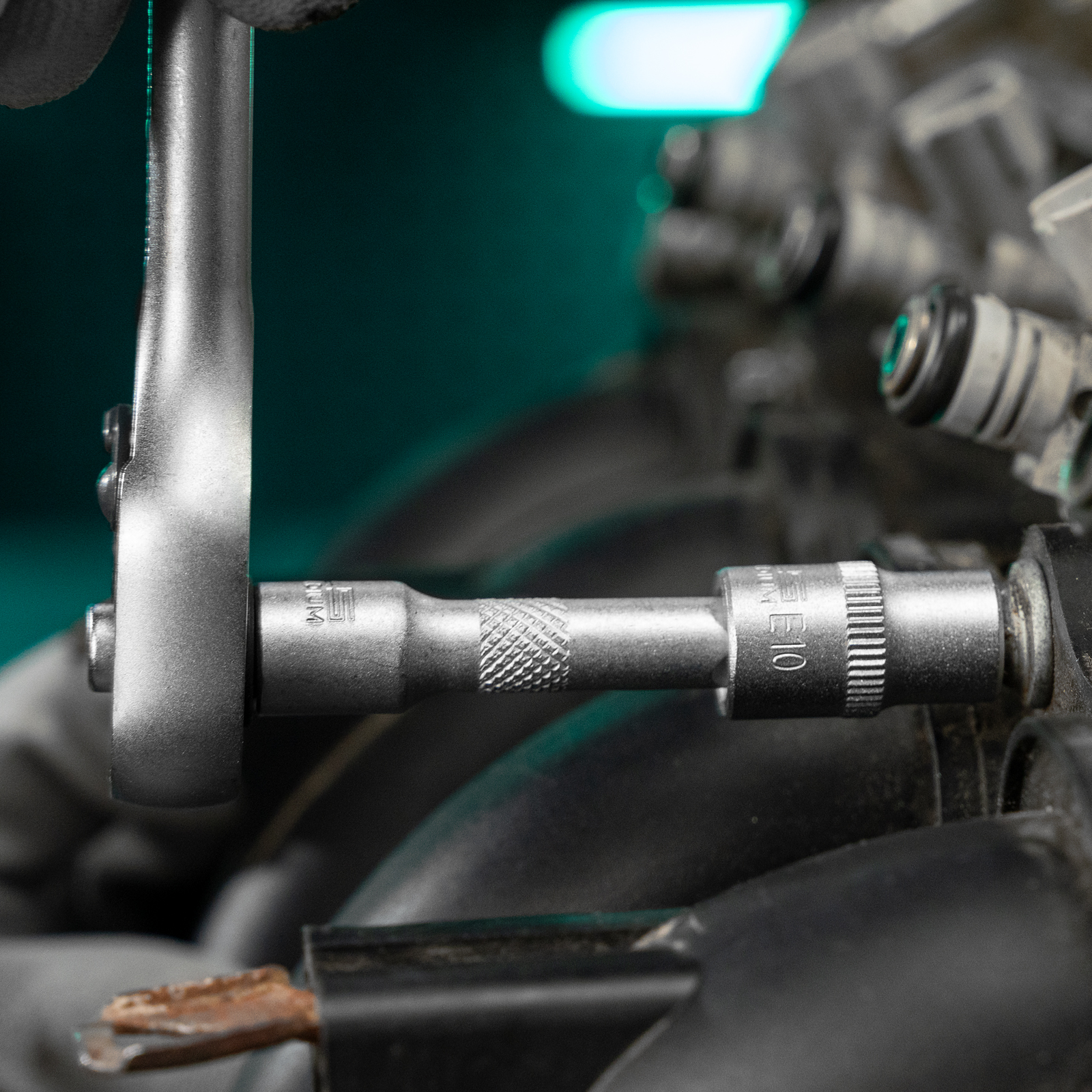 - Защита от разрушения — антикоррозийное покрытие "матовый хром" предотвращает появление ржавчины, а рукоятка трещотки из полипропилена и резины устойчива к воздействию бензина и масла.