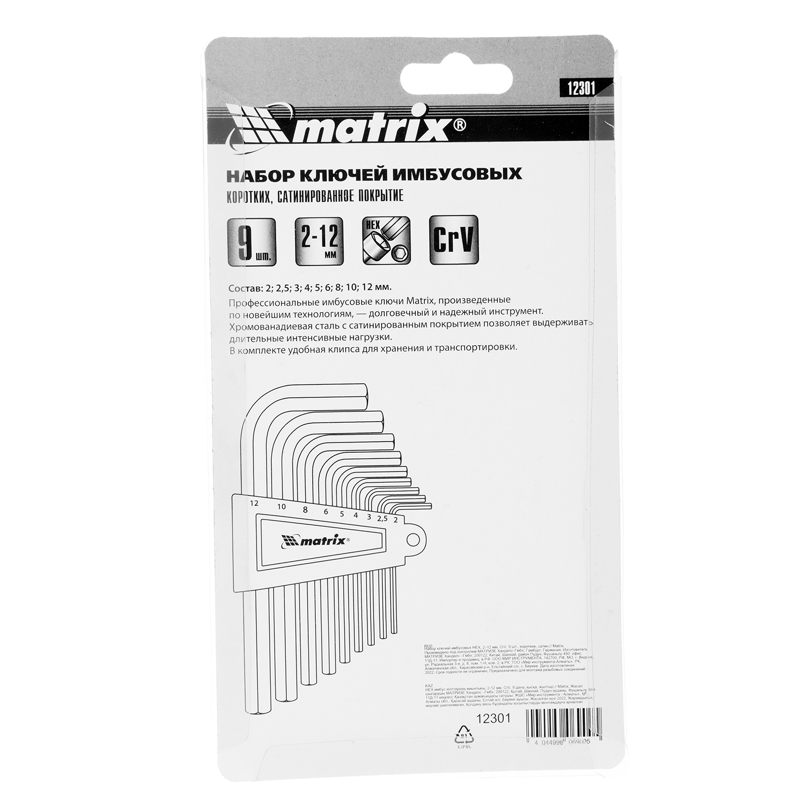 Набор ключей имбусовых HEX, 2-12 мм, CrV, 9 шт, короткие с сатинированным покрытием Matrix в Краснодаре