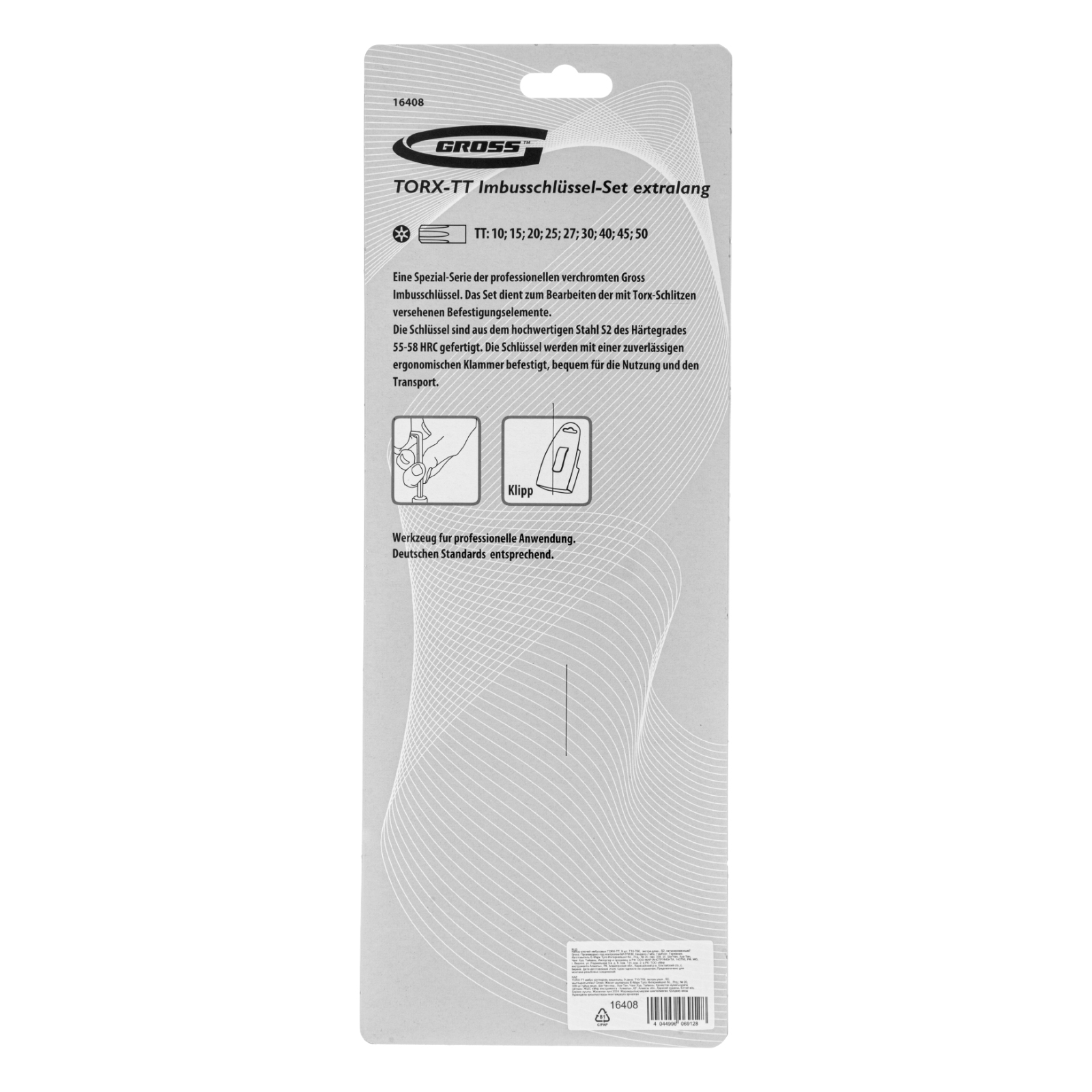 Набор Gross 16408 из стали S2 включает в себя 9 экстрадлинных сатинированных имбусовых ключей для работы с крепежом, имеющим шлицы Torx и Tamper-Torx T10-T50. Благодаря увеличенной длине и Г-образной форме ключи позволяют действовать в труднодоступных местах и экономить усилия при монтаже и демонтаже крепежа. Набор пригодится для ремонта электроприборов.