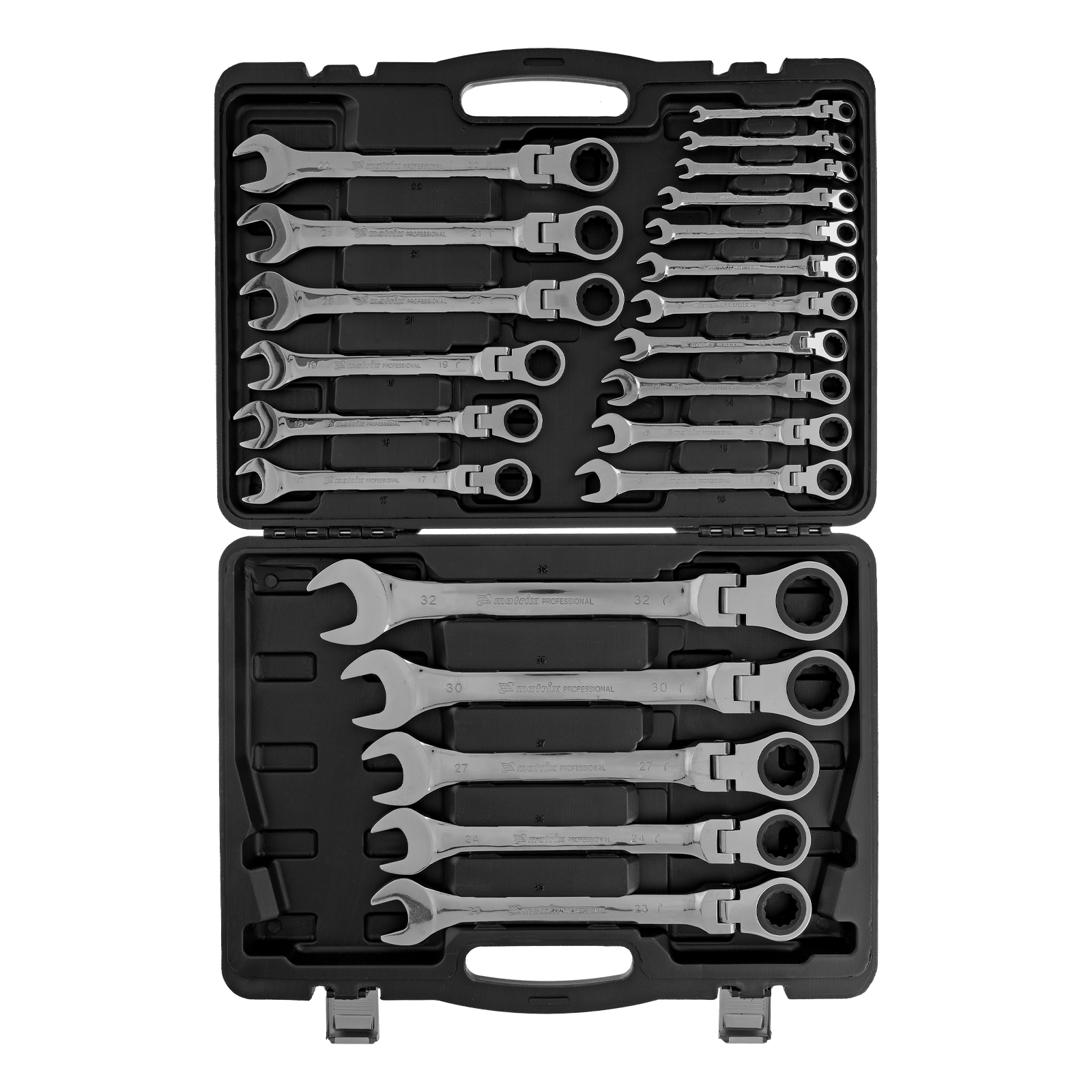 Набор ключей комбинированных, трещоточных шарнирных - 22 шт, типоразмеры - 6, 7, 8, 9, 10, 11, 12, 13, 14, 15, 16, 17, 18, 19, 20, 21, 22, 23, 24, 27, 30, 32 |