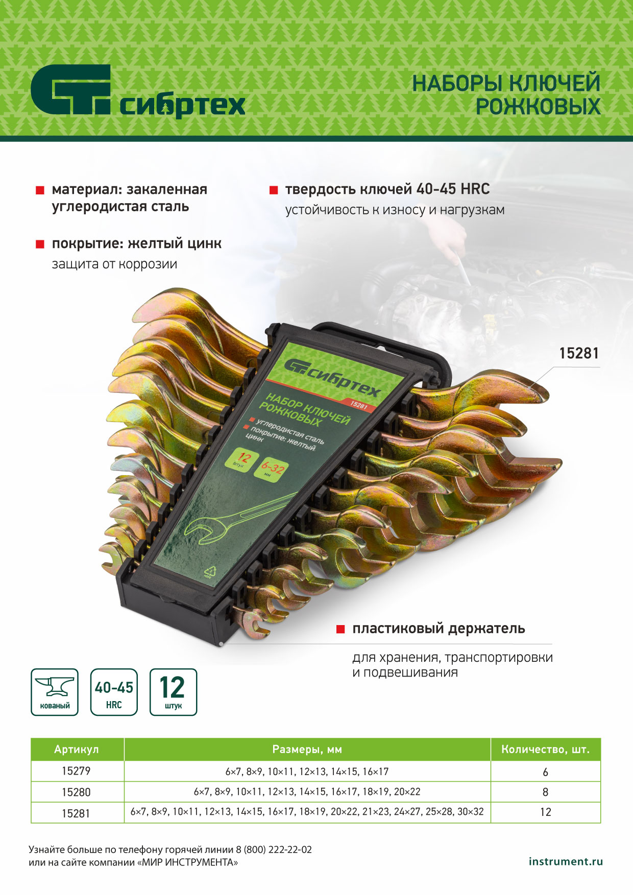 Набор рожковых ключей Сибртех 15280 размером 6-22 мм, с покрытием «желтый цинк», 8 штук в упаковке, используется для монтажа и демонтажа шестигранного резьбового крепежа соответствующего диаметра. Каждый ключ имеет две рабочие части с разным размером зева. Набор будет полезен в сервисном центре, авторемонтной мастерской, при выполнении монтажных работ. Пригодится также дома и на даче.