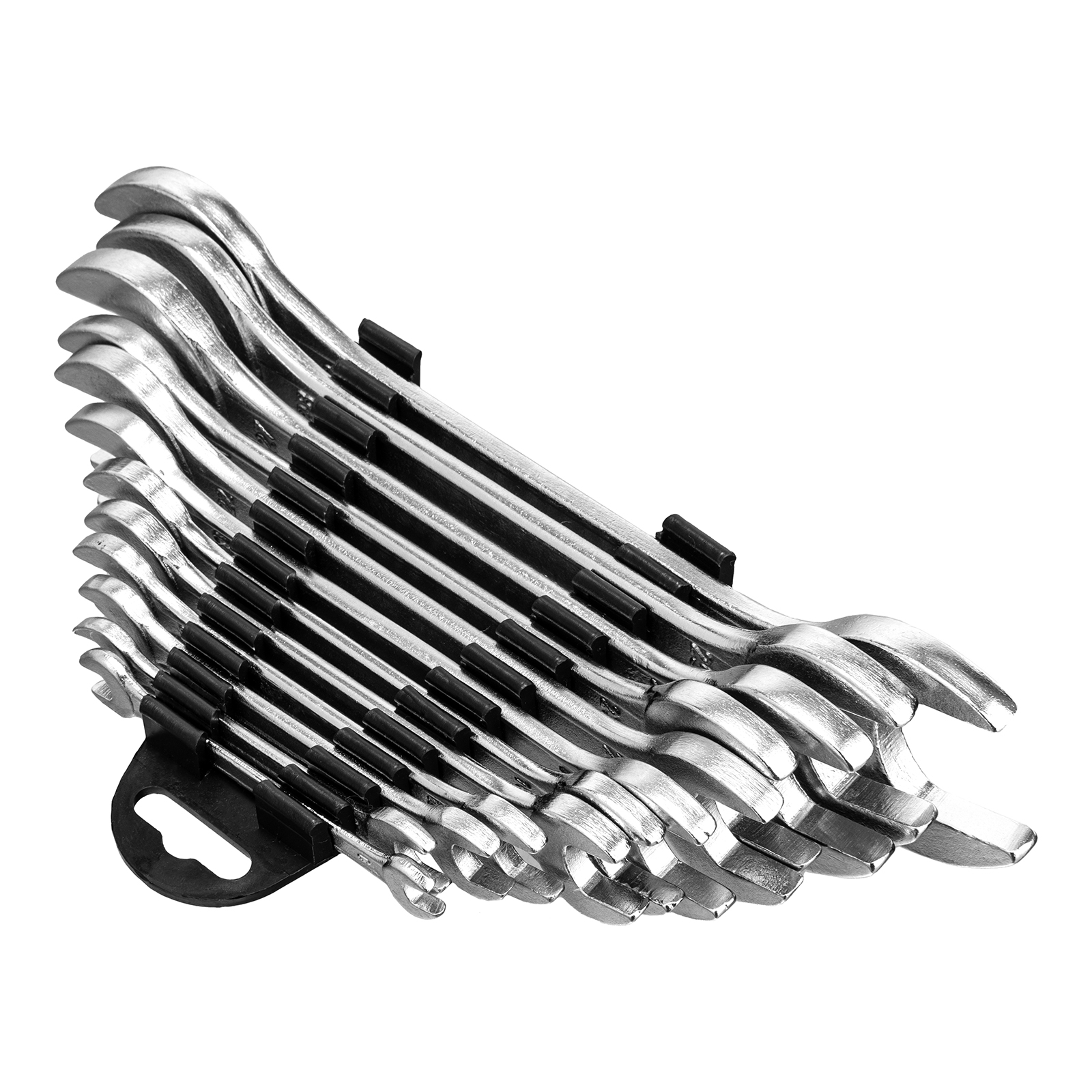 Набор из 12 хромированных рожковых ключей Sparta 152945 предназначен для откручивания и закручивания болтов, гаек и других крепежей с шестигранным профилем размером от 6 до 32 мм. У каждого ключа имеются рабочие губки с различным размером зева. Они расположены под углом к рукоятке, что облегчает работу в стесненных условиях. Инструменты используются для сборки и разборки оборудования, при проведении монтажных работ, будут полезны дома, на даче или в гараже.