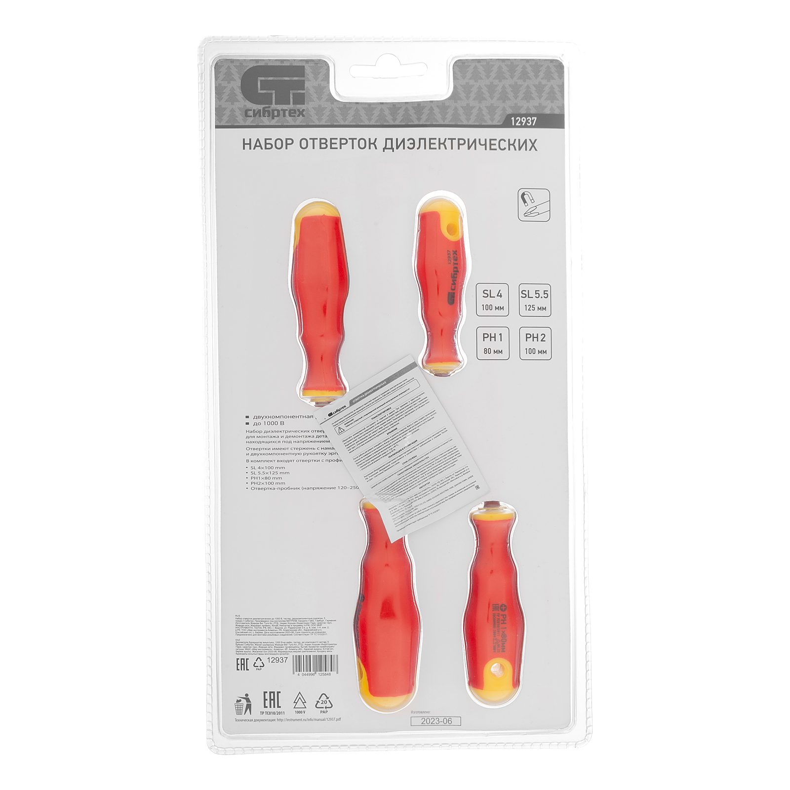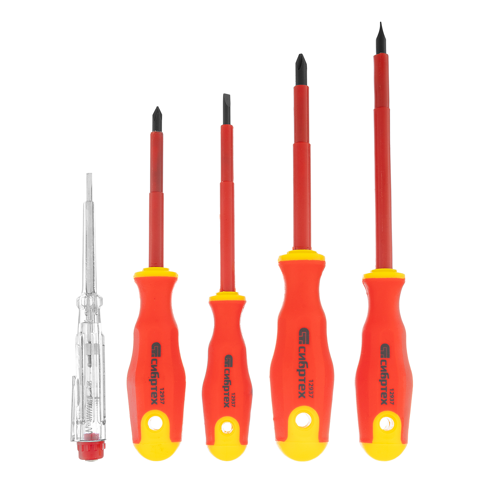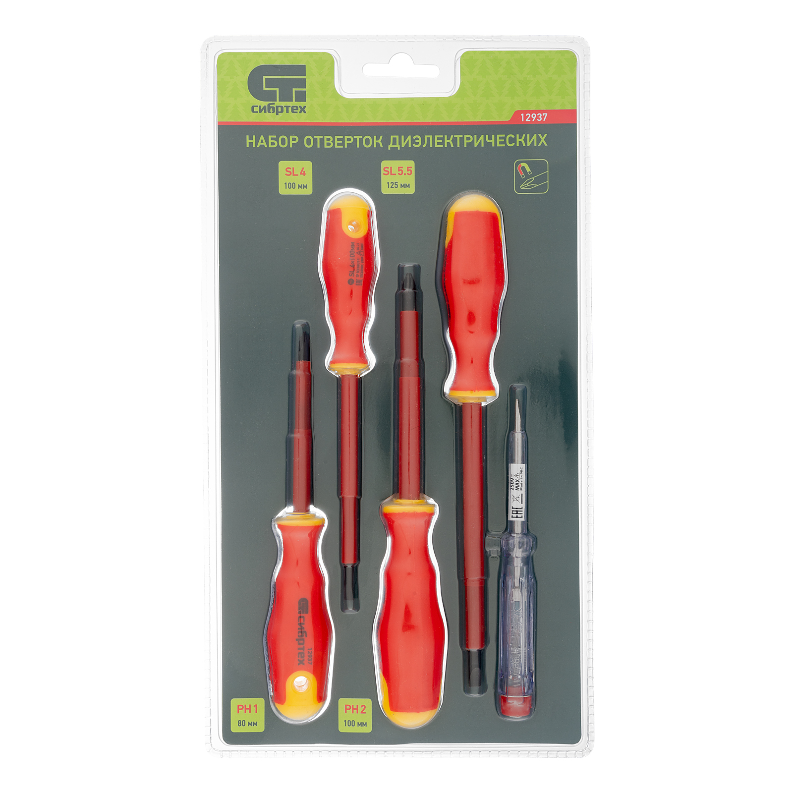 Набор диэлектрических отверток и тестер Сибртех 12937, CrV, с двухкомпонентными рукоятками, состоит из 5 предметов, которые пригодятся при обслуживании электрооборудования и электроприборов. Диэлектрическое покрытие защищает оператора от поражения током во время работ под напряжением до 1000 В. Широкий диапазон длины стержней отверток 80-125 мм позволяет выбрать оптимальную в зависимости от степени углубления крепежа. Важно — техника безопасности запрещает работу под напряжением даже при использовании инструмента с диэлектрическим покрытием!