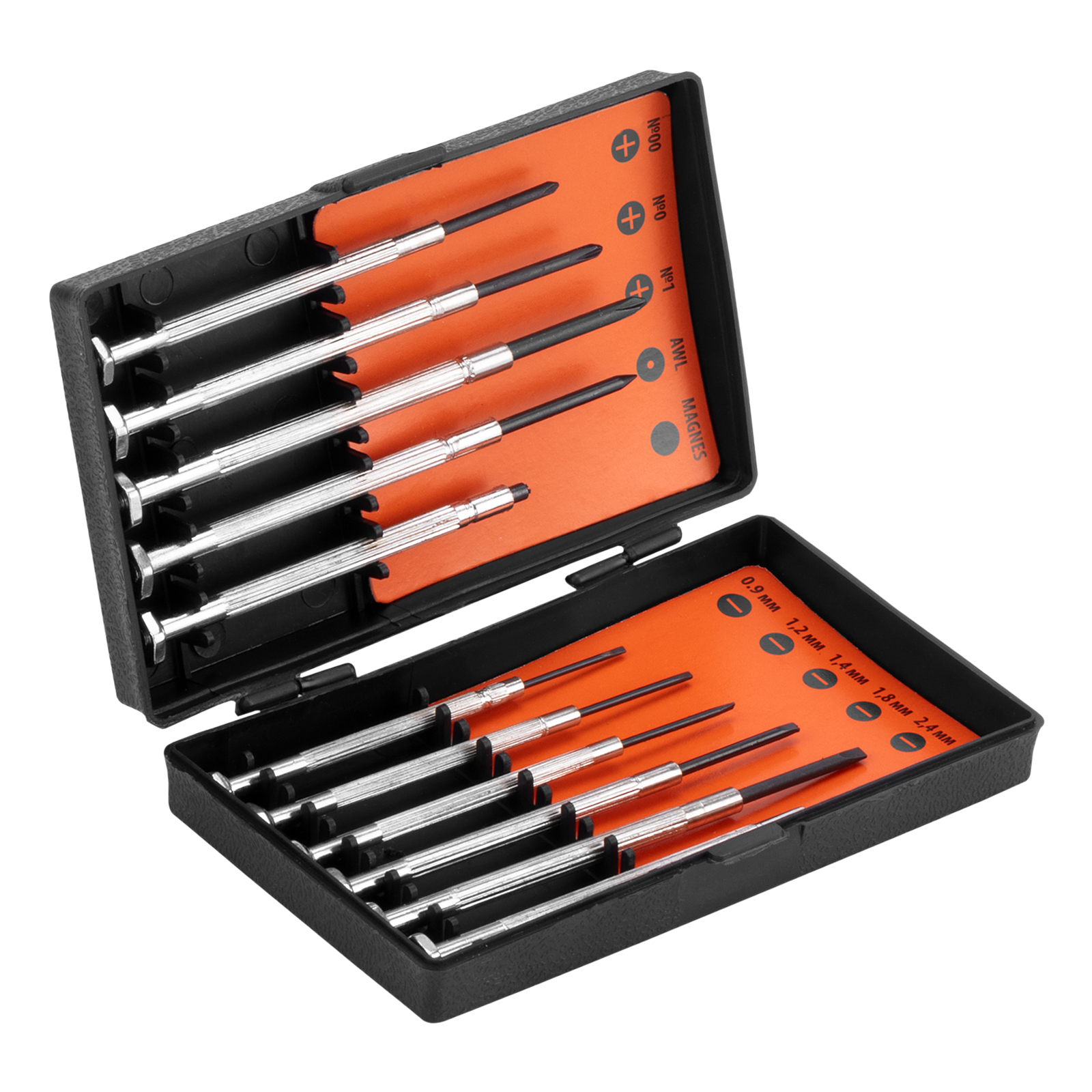 Набор отверток Sparta 133605, 11 предметов, используется для точной механики при осуществлении монтажа/демонтажа микровинтов со шлицами SL и PH. Он рассчитан на несложные бытовые работы, может применяться в частной мастерской. С помощью набора легко ремонтировать мелкие бытовые приборы, очки, часы и т.д.