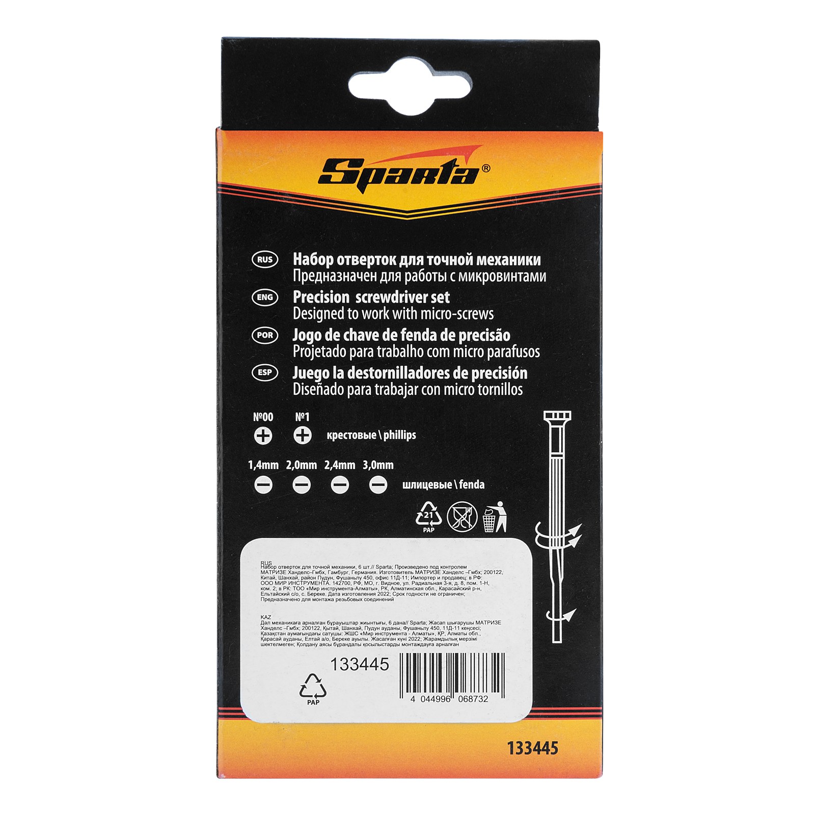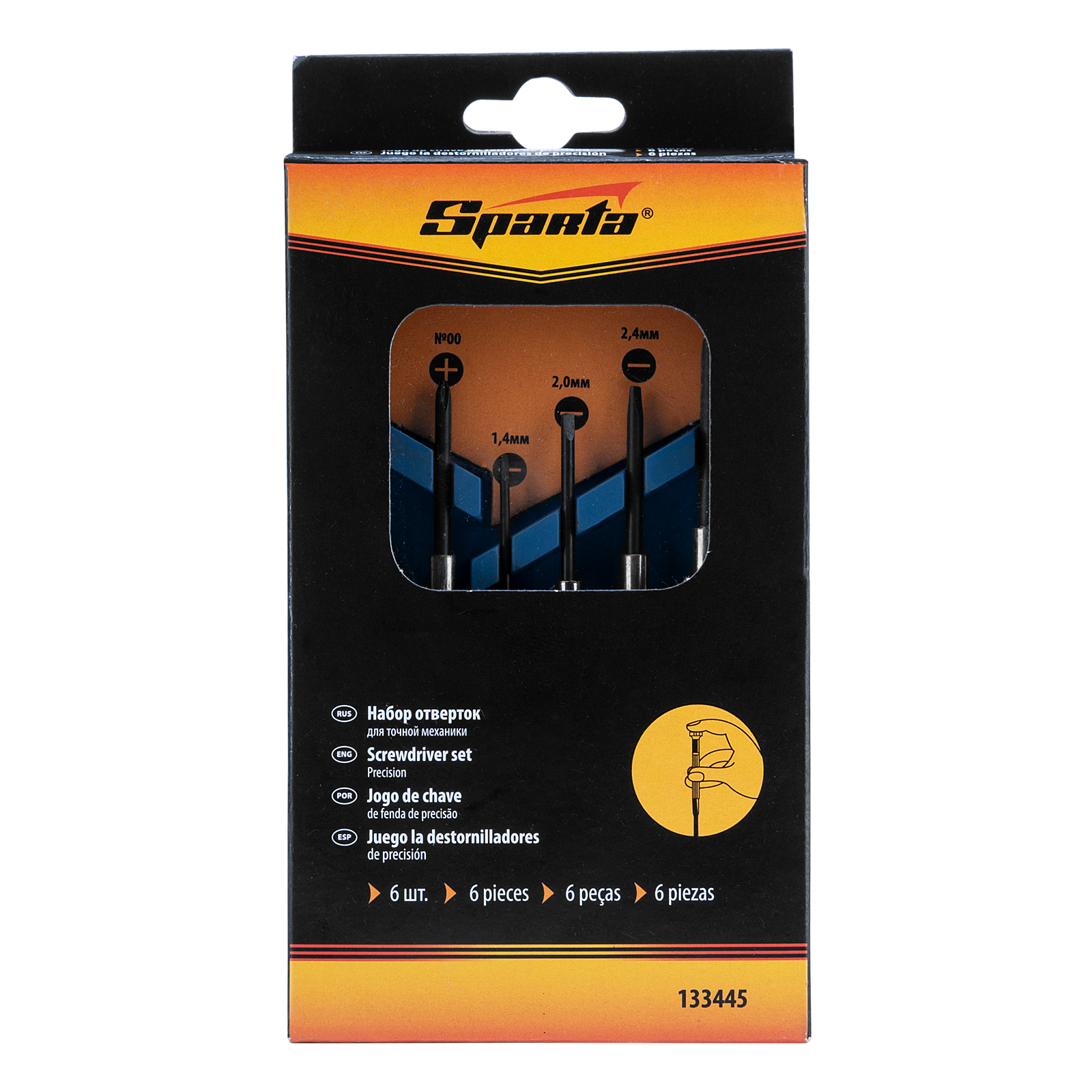 Набор отверток Sparta 133445, 6 предметов, используется для точной механики при осуществлении монтажа/демонтажа микровинтов со шлицами SL и PH. Он рассчитан на несложные бытовые работы, может применяться в частной мастерской. С помощью набора легко ремонтировать мелкие бытовые приборы, очки, часы и т.д.