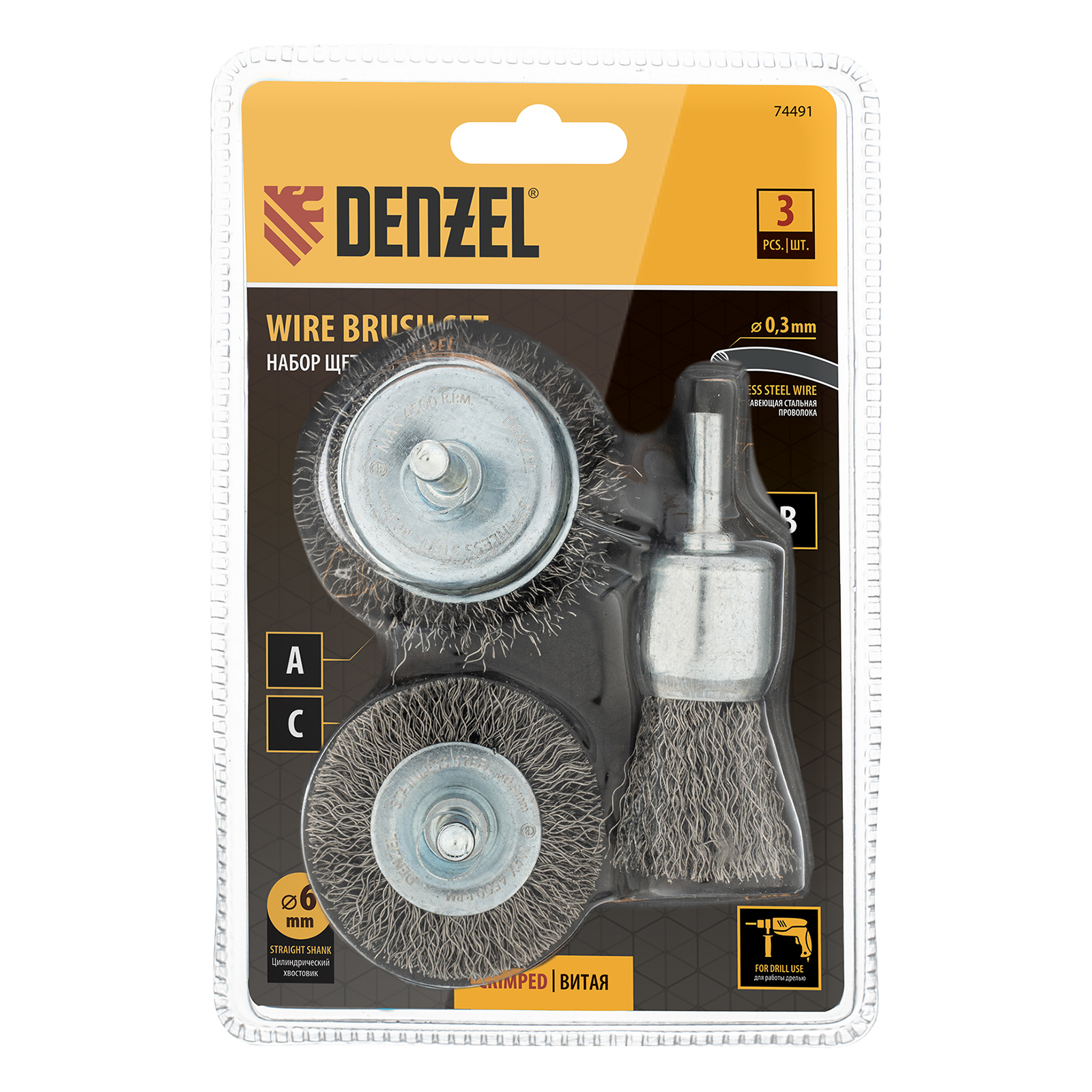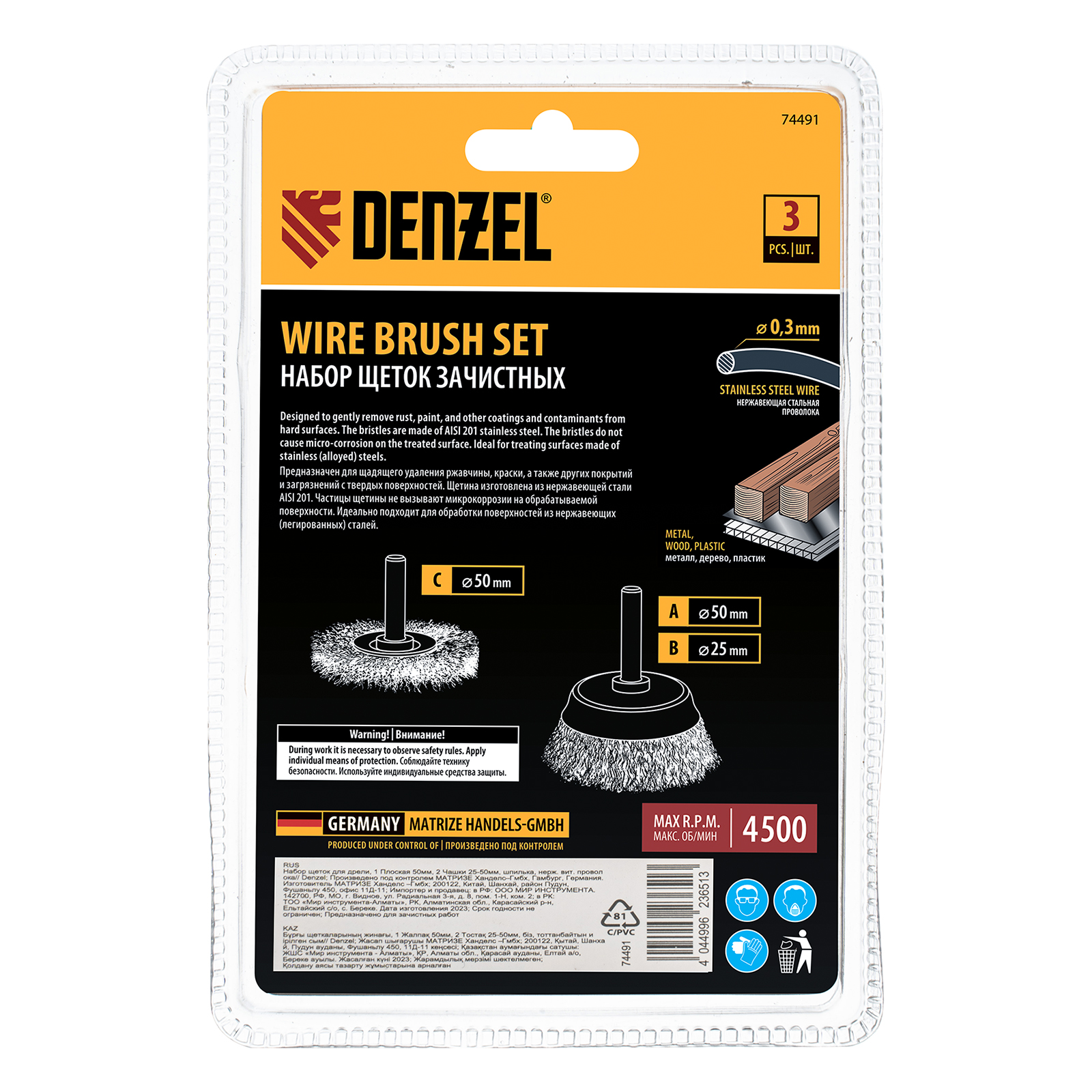 Набор щеток для дрели, 1 Плоская 50мм, 2 Чашки 25-50мм, шпилька, нерж. вит. проволока Denzel в Краснодаре