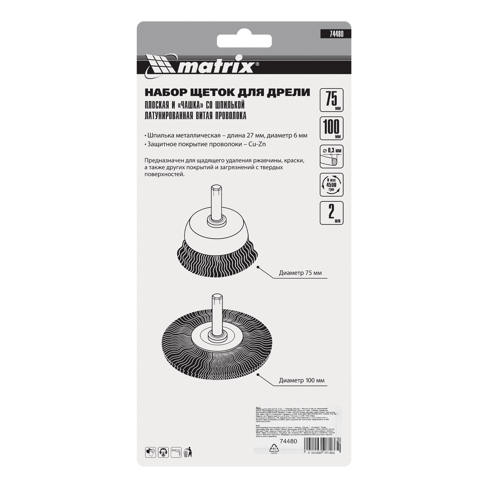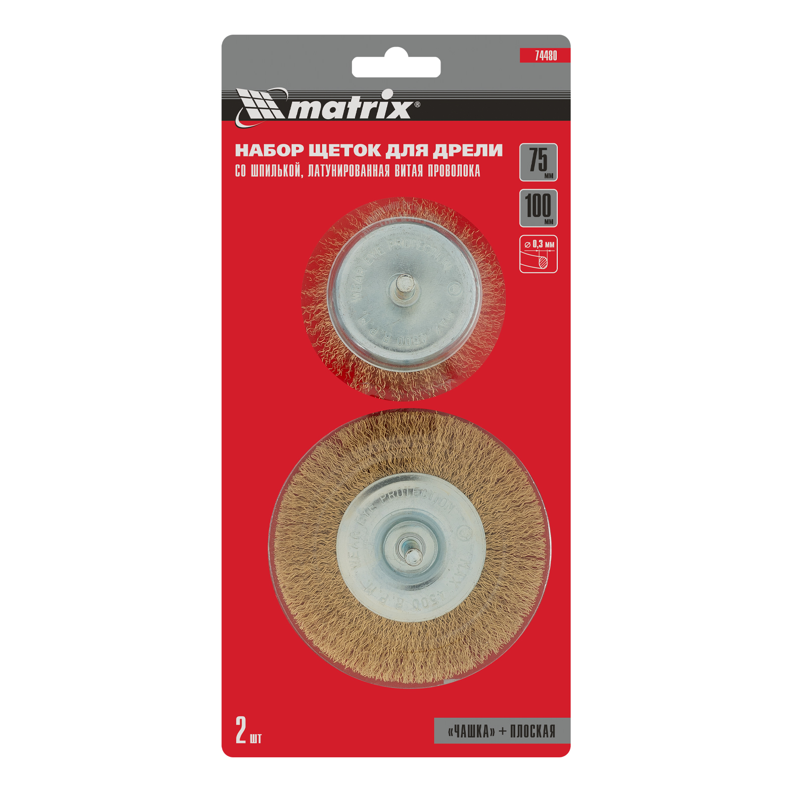 Набор щеток для дрели, 2 шт, 1 плоская, 100 мм, 1 "чашка", 75 мм, со шпильками Matrix в Краснодаре
