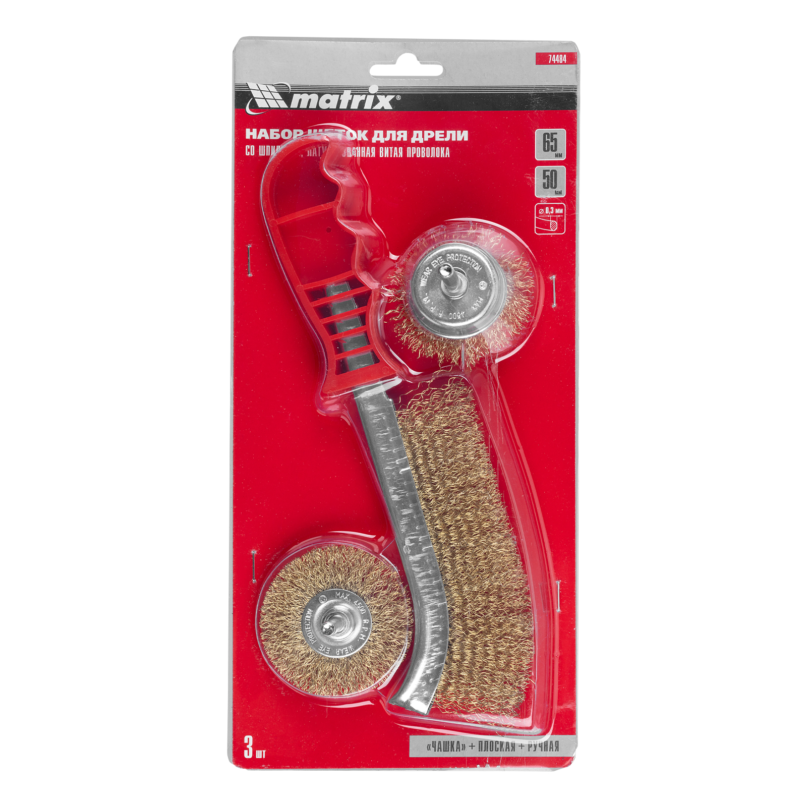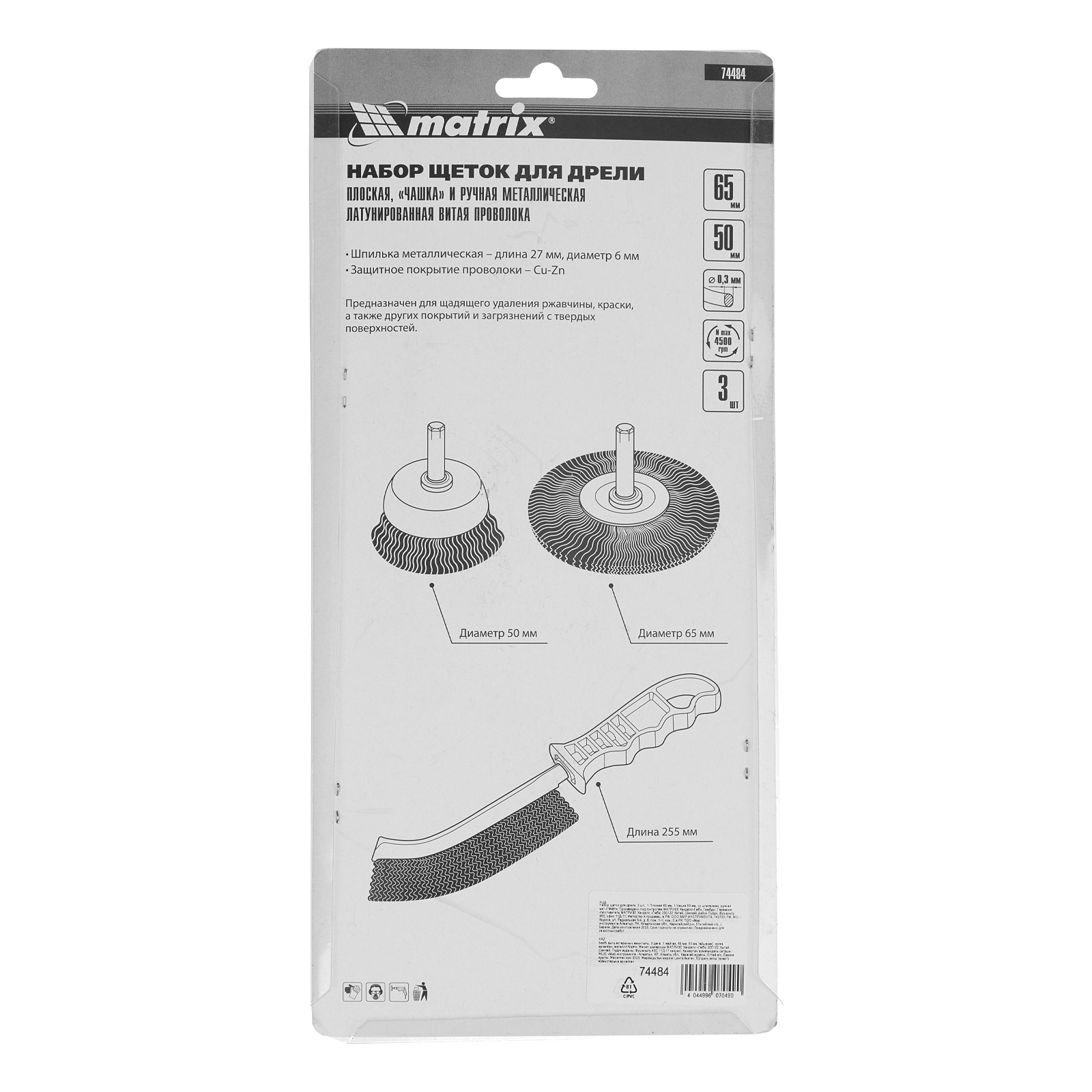 Набор Matrix 74484 состоит из 3 щеток: плоской диаметром 65 мм, «чашки» диаметром 50 мм со шпильками диаметром 6 мм для дрели, а также ручной металлической. Они эффективно удаляют тонкий слой ржавчины, краски, лака, а также убирают загрязнения. Насадкой в форме чашки удобно обрабатывать ровные поверхности, а плоской — работать в пазах и углах. Рекомендовано использование инструмента со скоростью вращения шпинделя до 4500 об/мин. Ручная щетка пригодится для обработки небольших площадей, когда применение электроинструментов нецелесообразно.