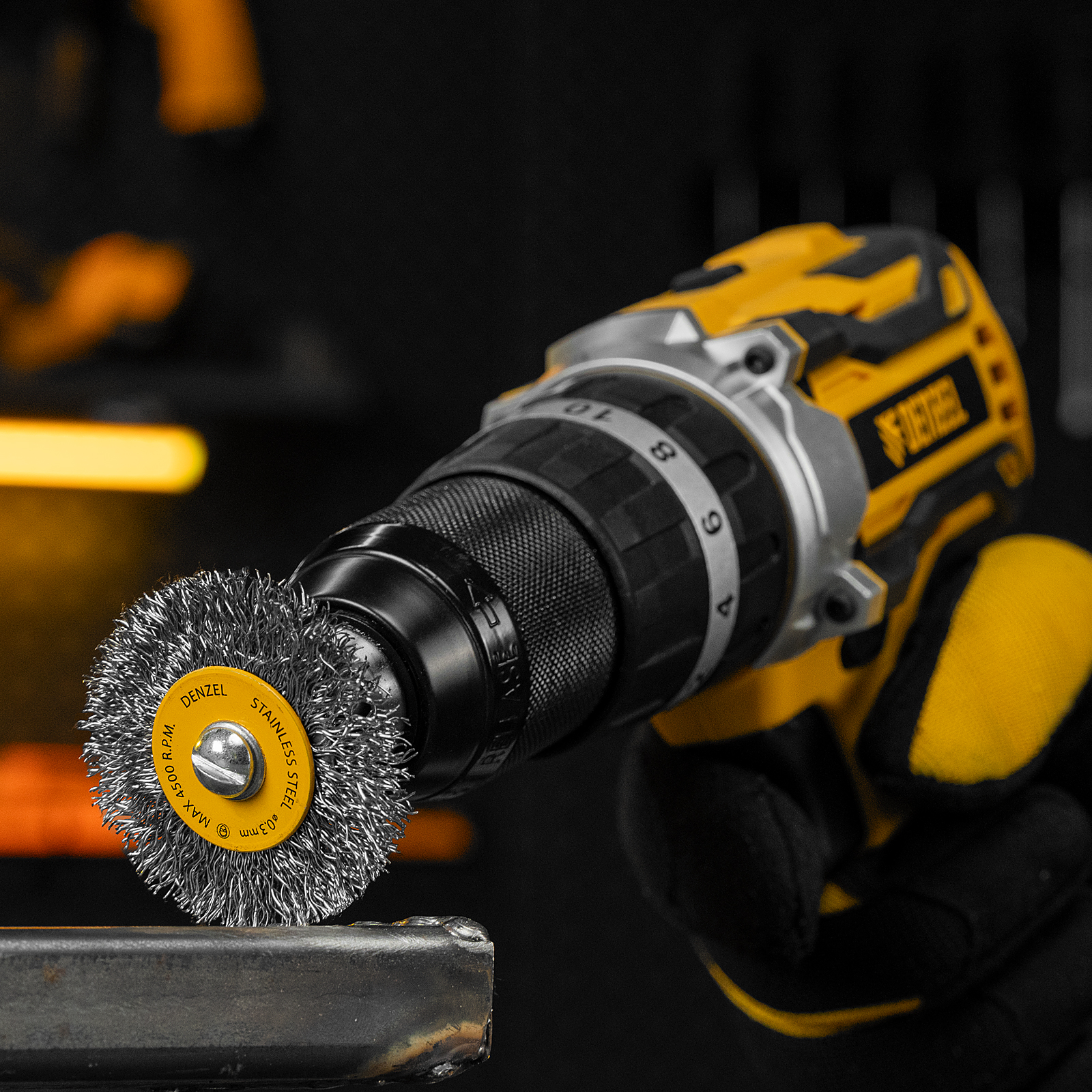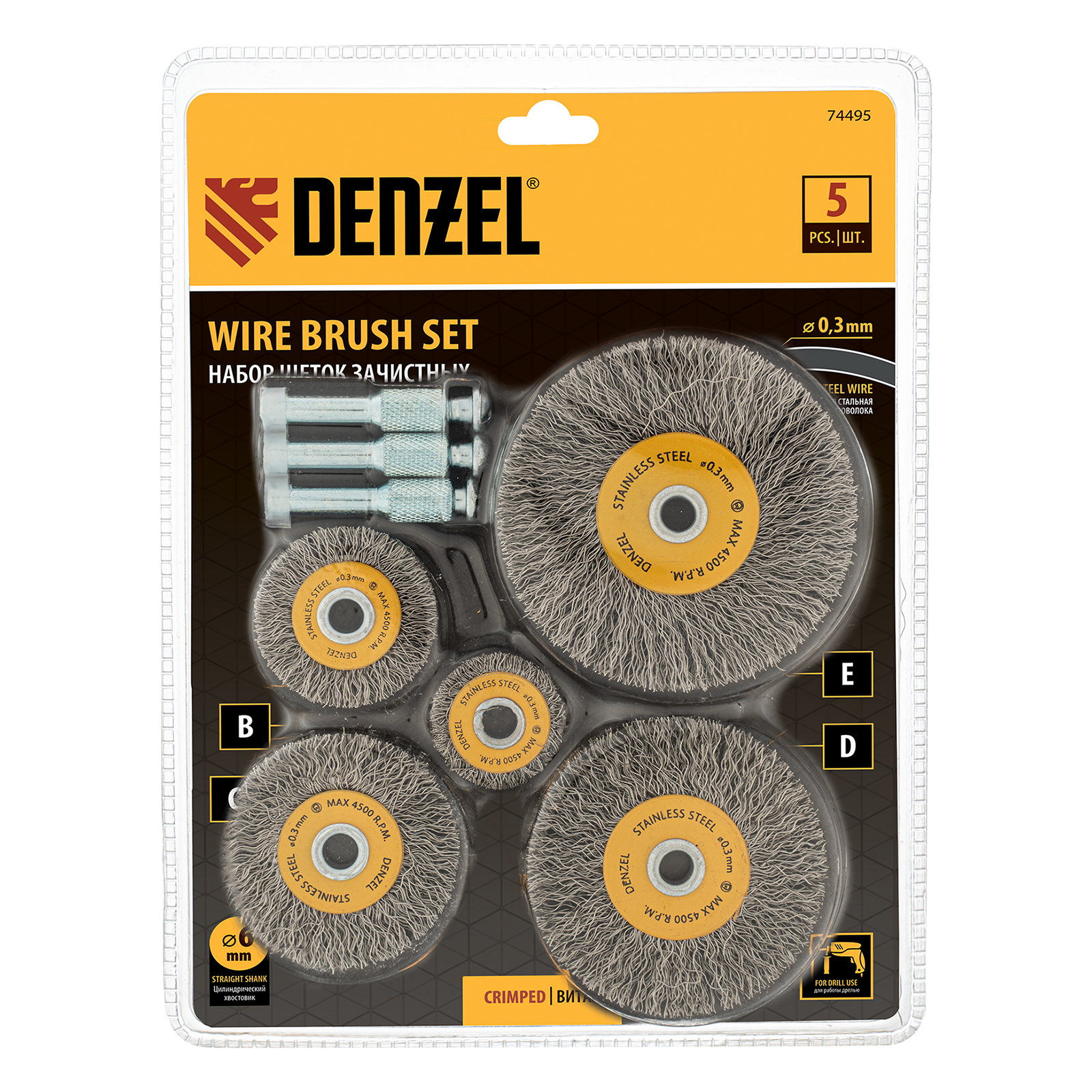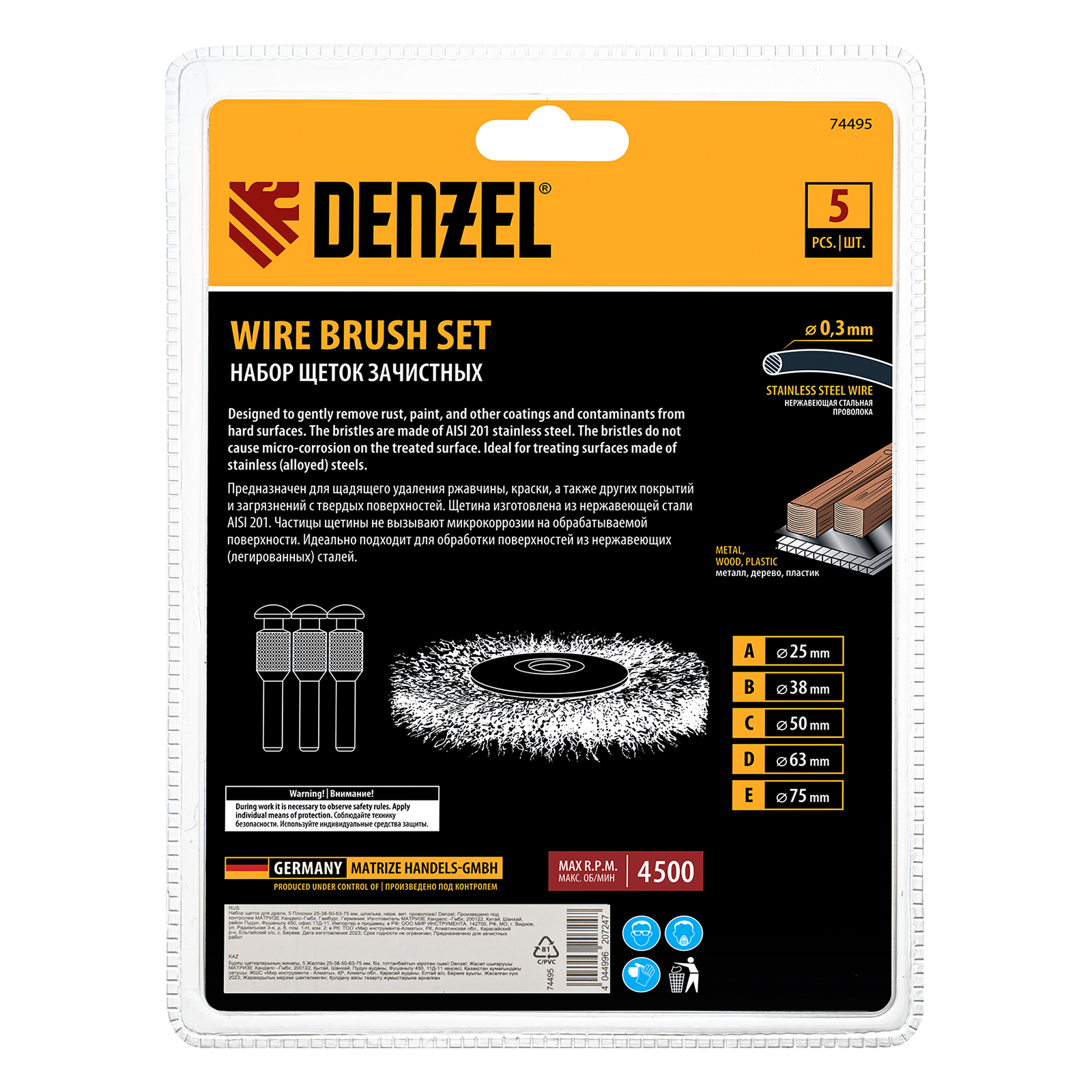Набор щеток для дрели, 5 Плоских 25-38-50-63-75 мм, шпилька, нерж. вит. проволока Denzel в Краснодаре
