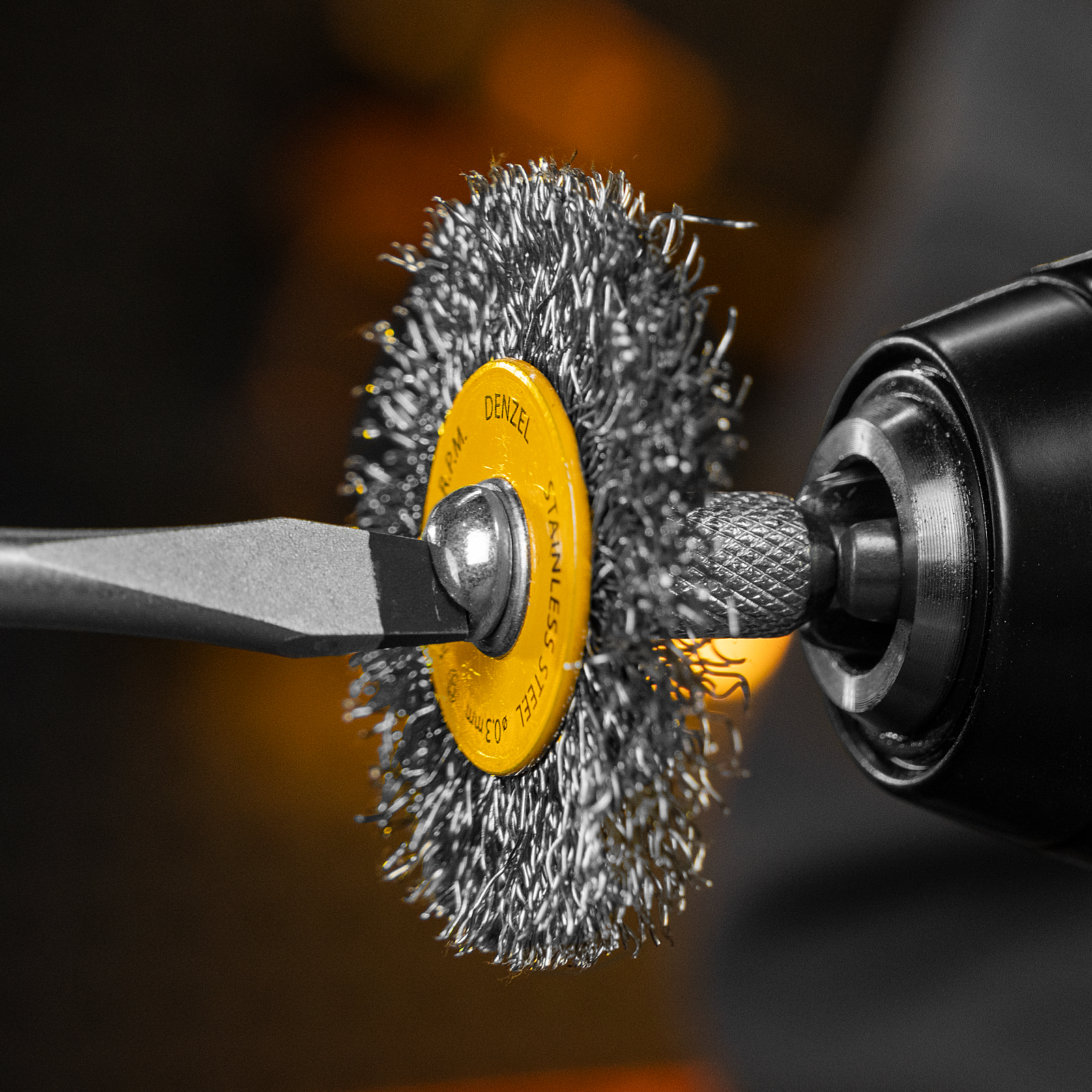 - Быстрая подготовка к работе — щетки имеют хвостовик диаметром 6 мм для установки в патрон дрели.