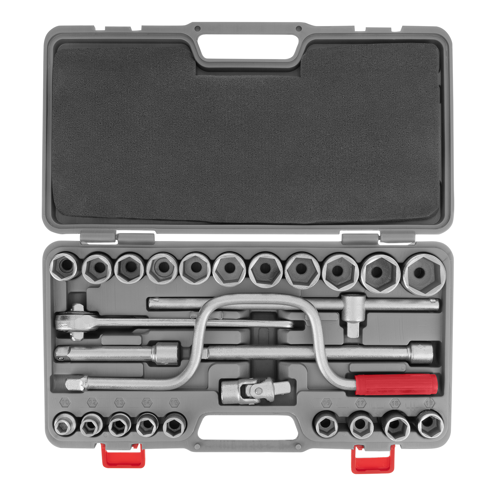 Головки 10, 11, 12, 13, 14, 15, 16, 17, 18, 19, 20, 21, 22, 23, 24, 25, 26, 27, 28, 30, 32 - 21 штКлюч трещотка - 1 штВороток Т-образный - 1 штУдлинители 125, 250 - 2 штШарнир - 1 штКоловорот - 1 штКейс - 1 штТрещотка - 1 шт |