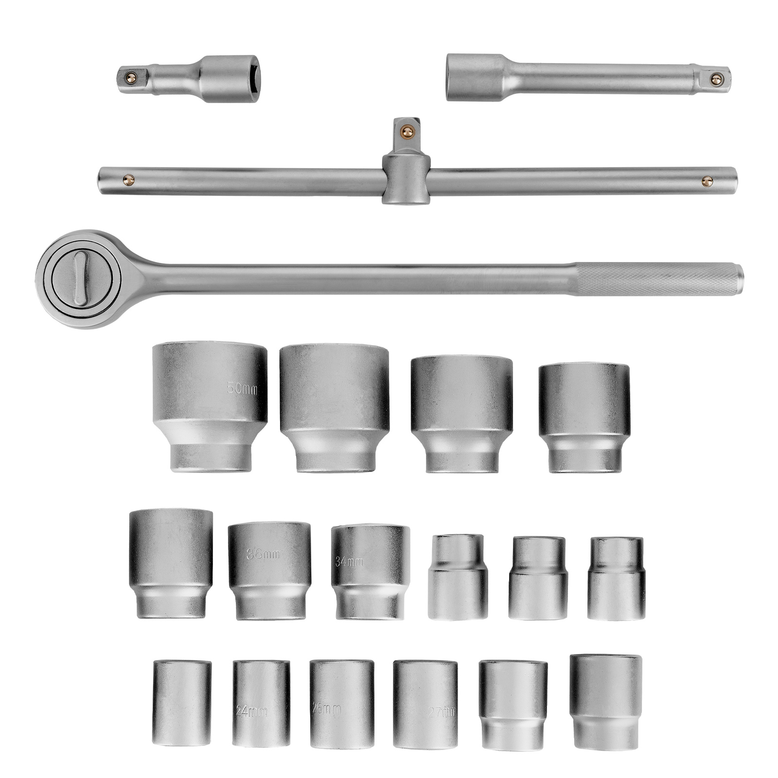 Ключ трещотка - 1 штВороток Т-образный - 1 штУдлинитель 100, 200 - 2 штГоловки 19, 21, 22, 23, 24, 26, 27, 30, 32, 34, 36, 38, 41, 46, 48, 50 - 16 штКейс - 1 шт |