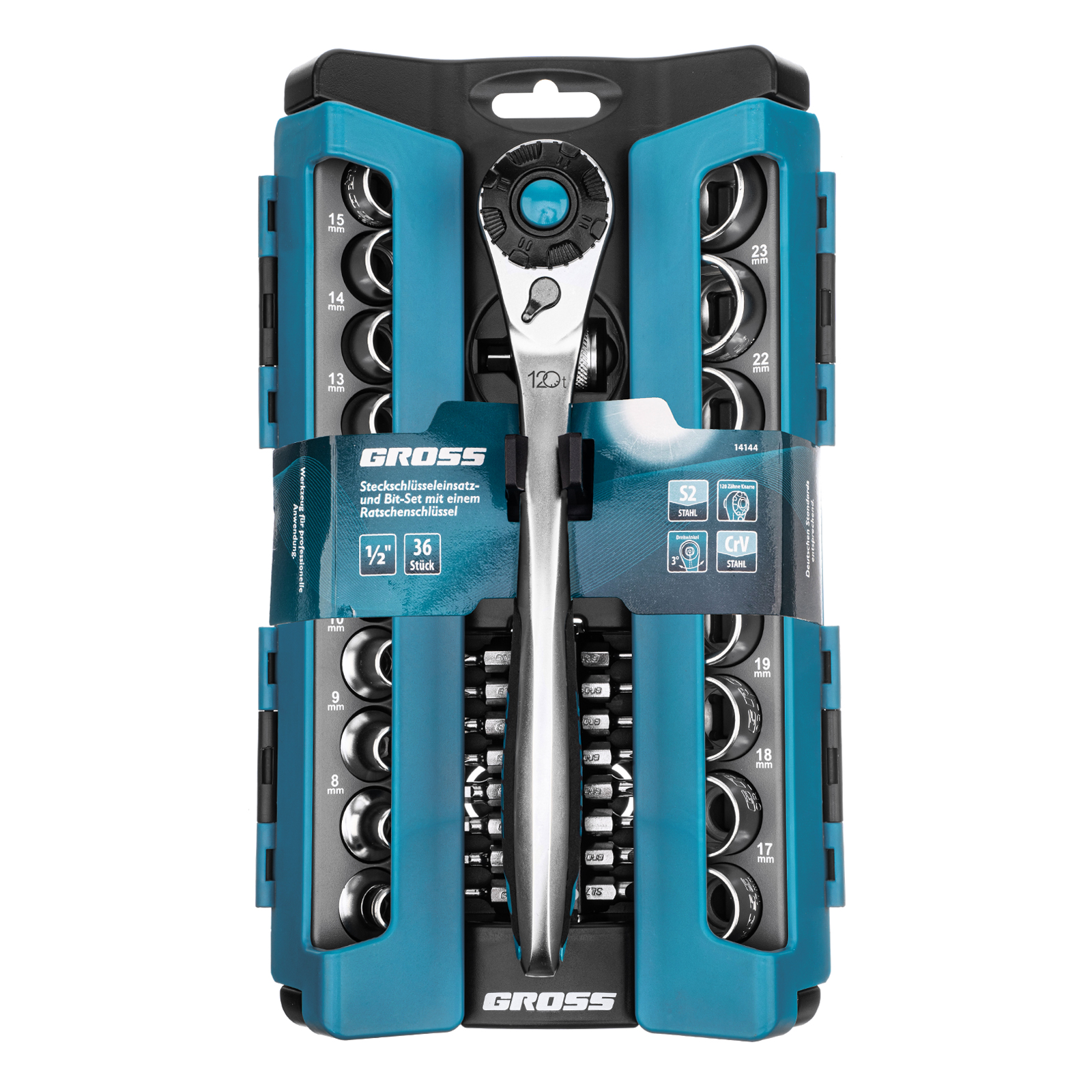 Набор Gross 14144 включает в себя 36 предметов с посадочным квадратом 1/2″: 17 торцевых головок, трещотку со 120 зубьями, переходник, адаптер и 16 бит. Применяется для монтажа и демонтажа резьбовых соединений при проведении технического обслуживания авто или для бытовых ремонтных работ. Набор подходит не только для самостоятельного использования в гараже и дома, но и для профессиональной эксплуатации на станциях техобслуживания.