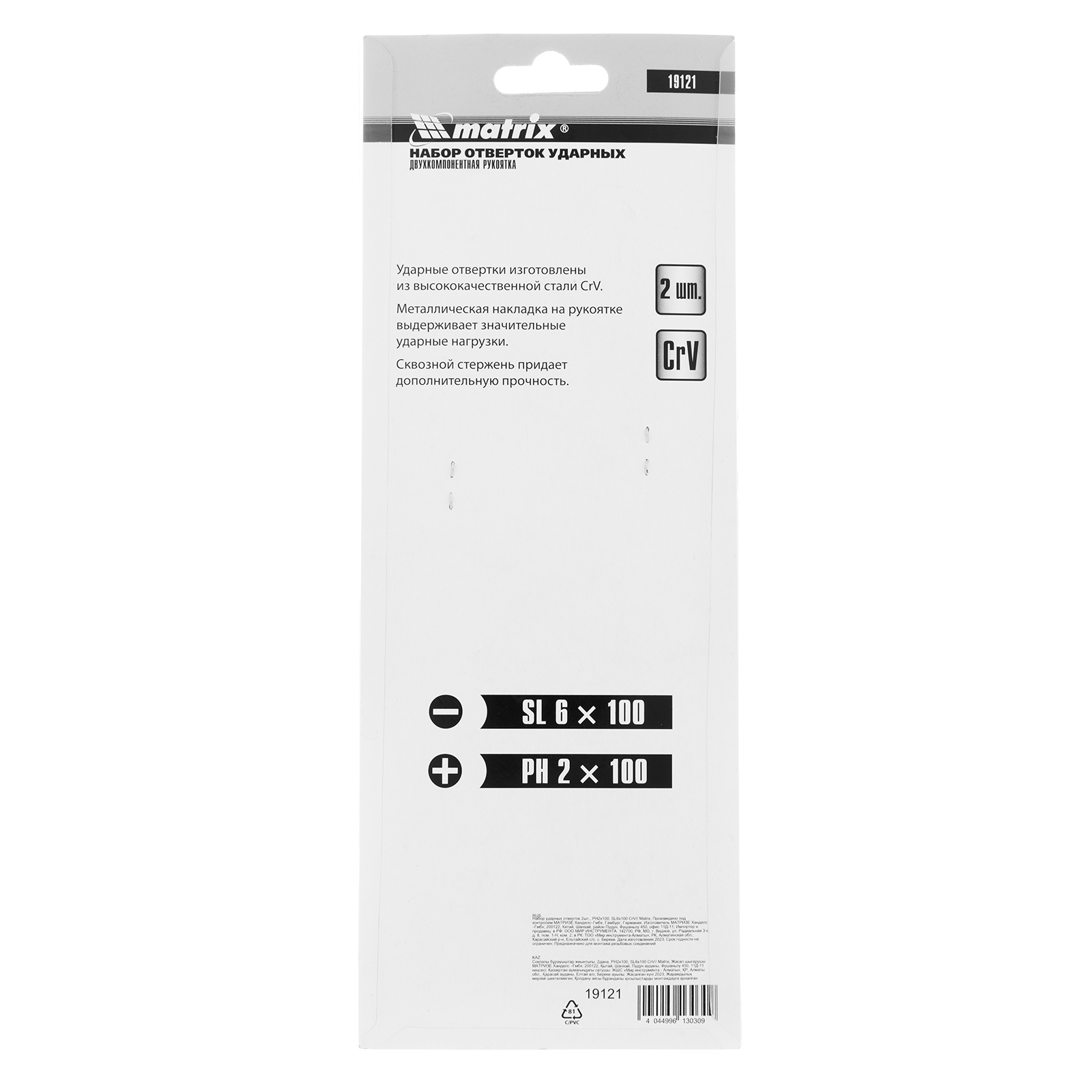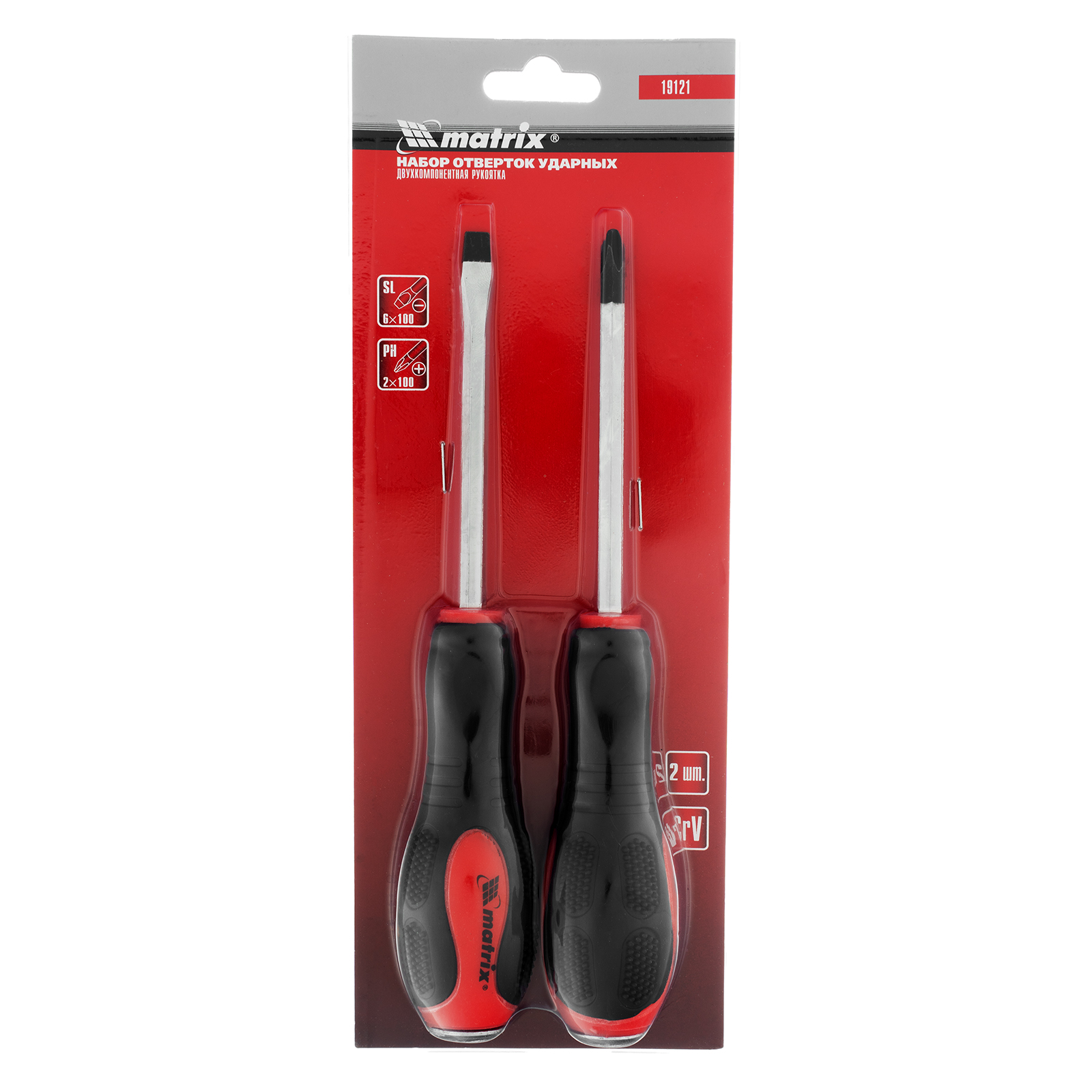 Набор ударных отверток Matrix 19121 из стали CrV включает 2 инструмента PH2x100, SL6x100 и предназначен для закручивания и откручивания резьбового крепежа. Металлический затыльник каждой отвертки выдерживает удары молотком или киянкой, поэтому отвертки могут использоваться для демонтажа перетянутых или прикипевших крепежей. Набор рекомендован для профессионального использования, будет полезен и в быту.