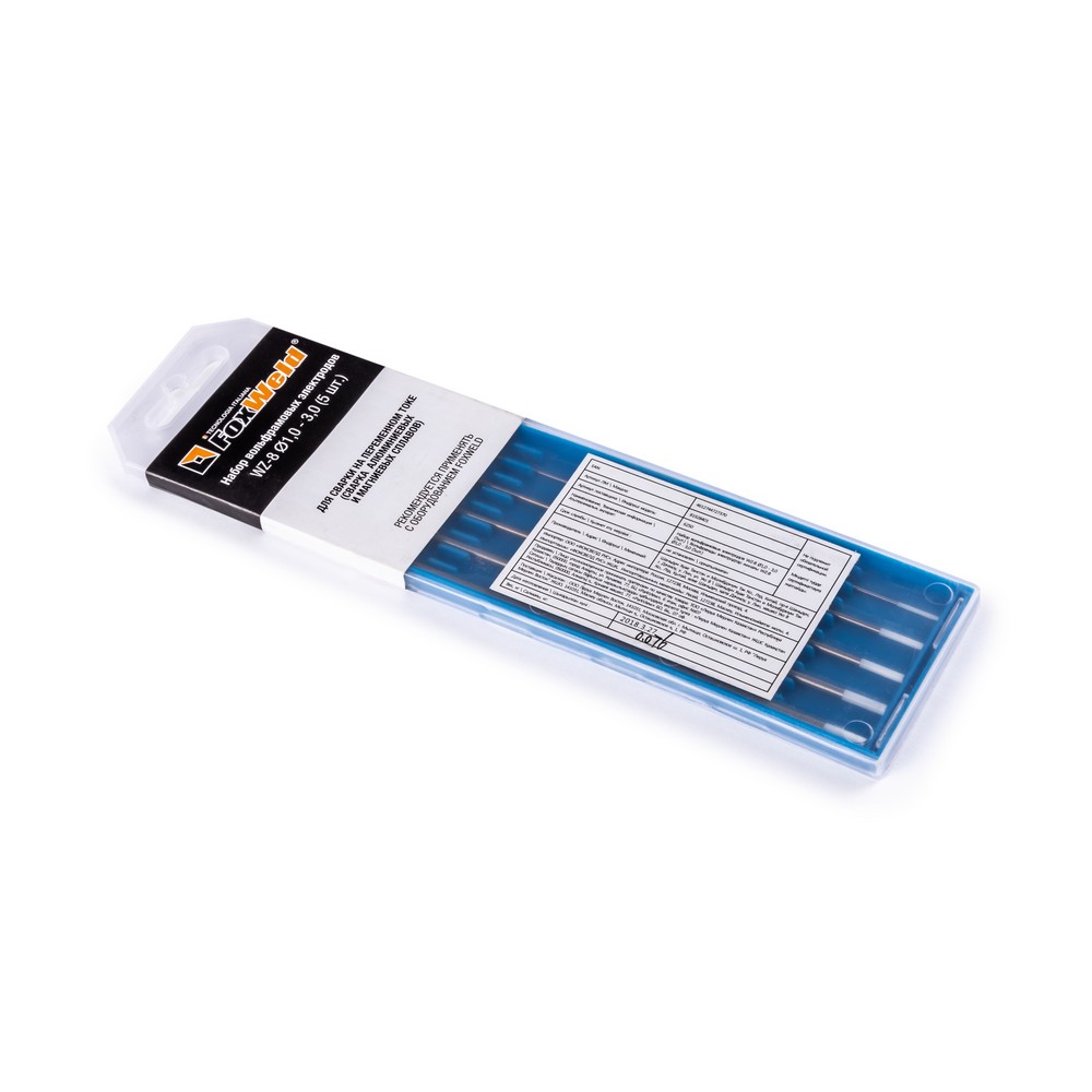 Набор неплавящихся вольфрамовых электродов марки WZ-8 предназначен для аргонодуговой сварки (TIG) на переменном (AC) токе. Электрод легирован оксидом циркония (ZrO₂). Вольфрамовые электроды WZ-8 используются для сварки алюминия, магния и их сплавов. Часто применяются в военно-промышленном комплексе. Электроды этой марки обеспечивают лёгкое зажигание и стабильное горение дуги, хорошо выдерживают высокую токовую нагрузку. Во время сварочного процесса кончик электрода формируют в форме сферы.ПРОЧНАЯ УПАКОВКАВольфрамовые электроды поставляются в специальных пластиковых пеналах. Прочная и жёсткая упаковка выгодно отличается от картонной, т.к. исключает случайную деформацию электродов при доставке и в условиях хранения на складе.ПРЕИМУЩЕСТВА:Набор из 5 электродов разного диаметра (1,0 / 1,6 / 2,0 / 2,4 / 3,0 мм)Сварка алюминия, магния и их сплавовСтабильная дугаВыдерживает большую токовую нагрузкуРабочий наконечник электрода формируется в форме сферыФУНКЦИОНАЛЬНЫЕ ОСОБЕННОСТИ:ПОДБОР ВОЛЬФРАМОВОГО ЭЛЕКТРОДА: Вольфрамовые электроды разделяются по цвету наконечников в зависимости от сферы применения, что необходимо учитывать при выборе.ЗНАЧЕНИЯ ТОКА ДЛЯ ЭЛЕКТРОДОВ РАЗЛИЧНОГО ДИАМЕТРА: * в таблице приведены примерные допустимые значения