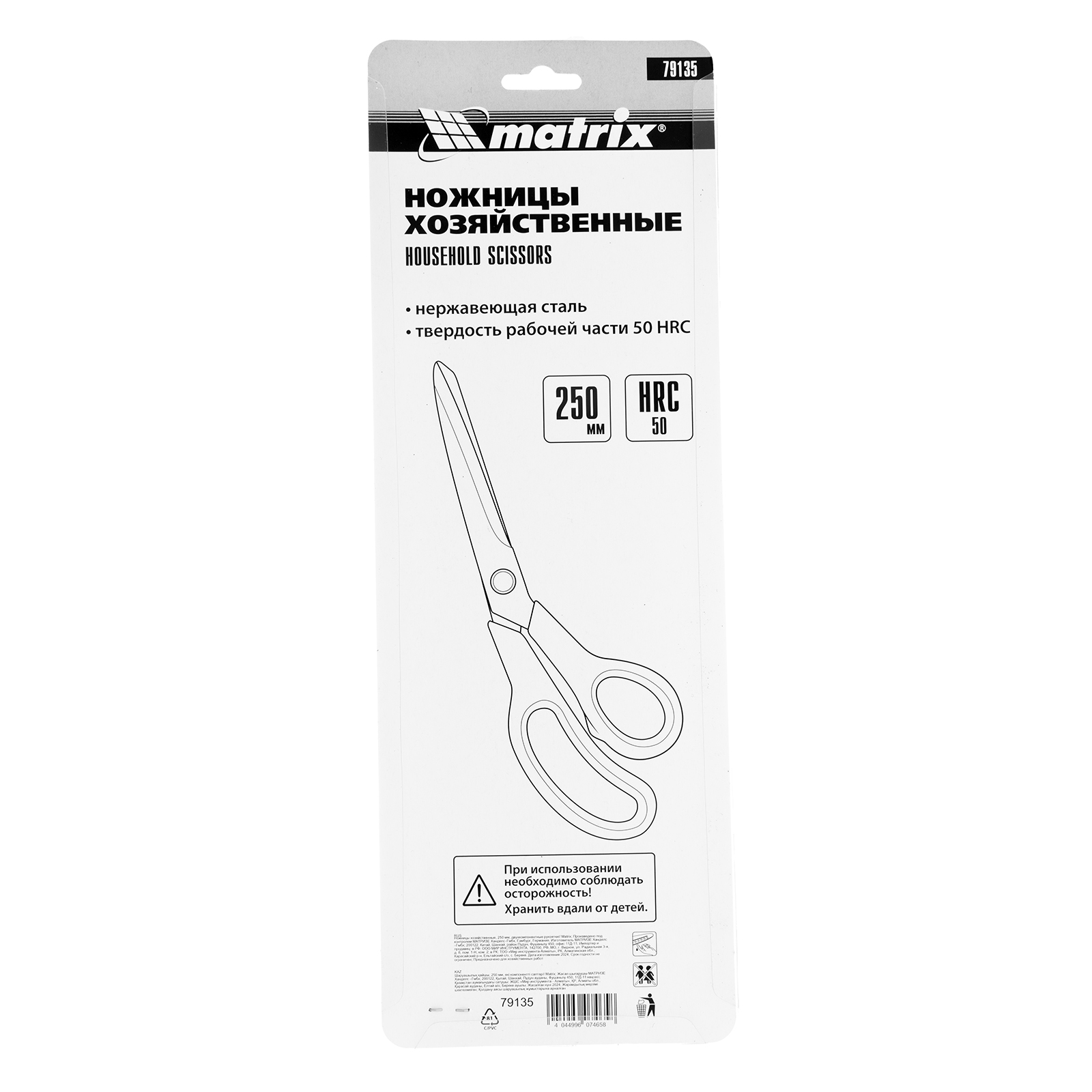 Хозяйственные ножницы Matrix 79135 длиной 250 мм, с двухкомпонентными рукоятками, используются для разрезания бумаги, картона, тканей и других материалов. Изогнутые рукоятки упрощают выполнение длинных продольных разрезов, например, при раскройке обоев. Инструмент применяется в быту.