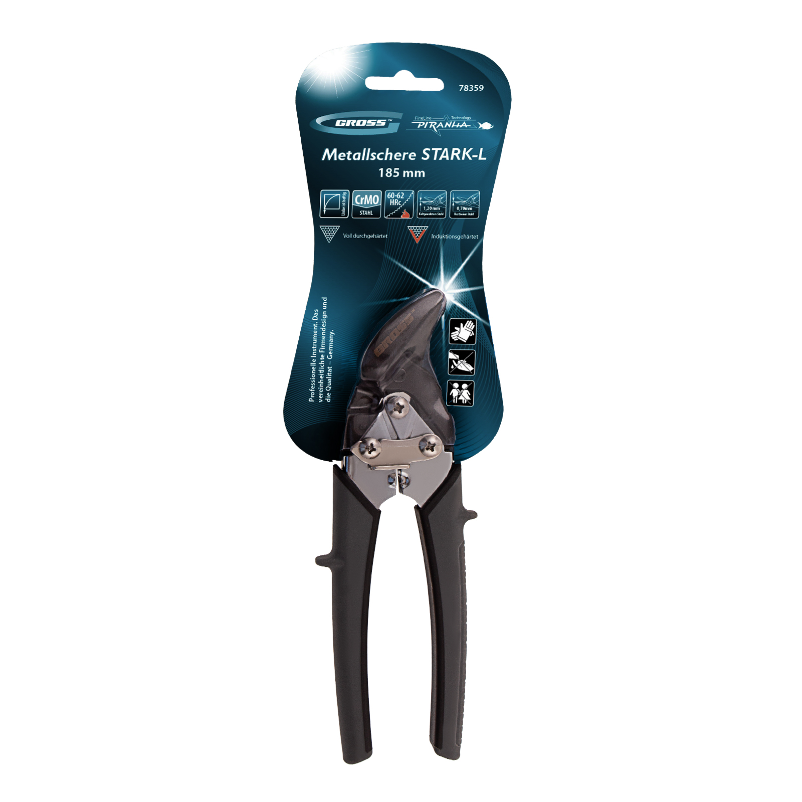 Ножницы по металлу Gross PIRANHA 78359 длиной 185 мм, из стали CrMo, с двухкомпонентными рукоятками, предназначены для прямого и криволинейного левого резания листовых заготовок. Выполняют точный рез цветных металлов, а также холоднокатаной стали толщиной до 1,2 мм и нержавеющей стали толщиной до 0,7 мм. Двойной рычажный механизм экономит усилия и повышает производительность ножниц. Общая длина инструмента составляет 185 мм, поэтому он удобен для работы в труднодоступных местах. Ножницы рекомендованы для профессионального применения, пригодятся также и в быту.