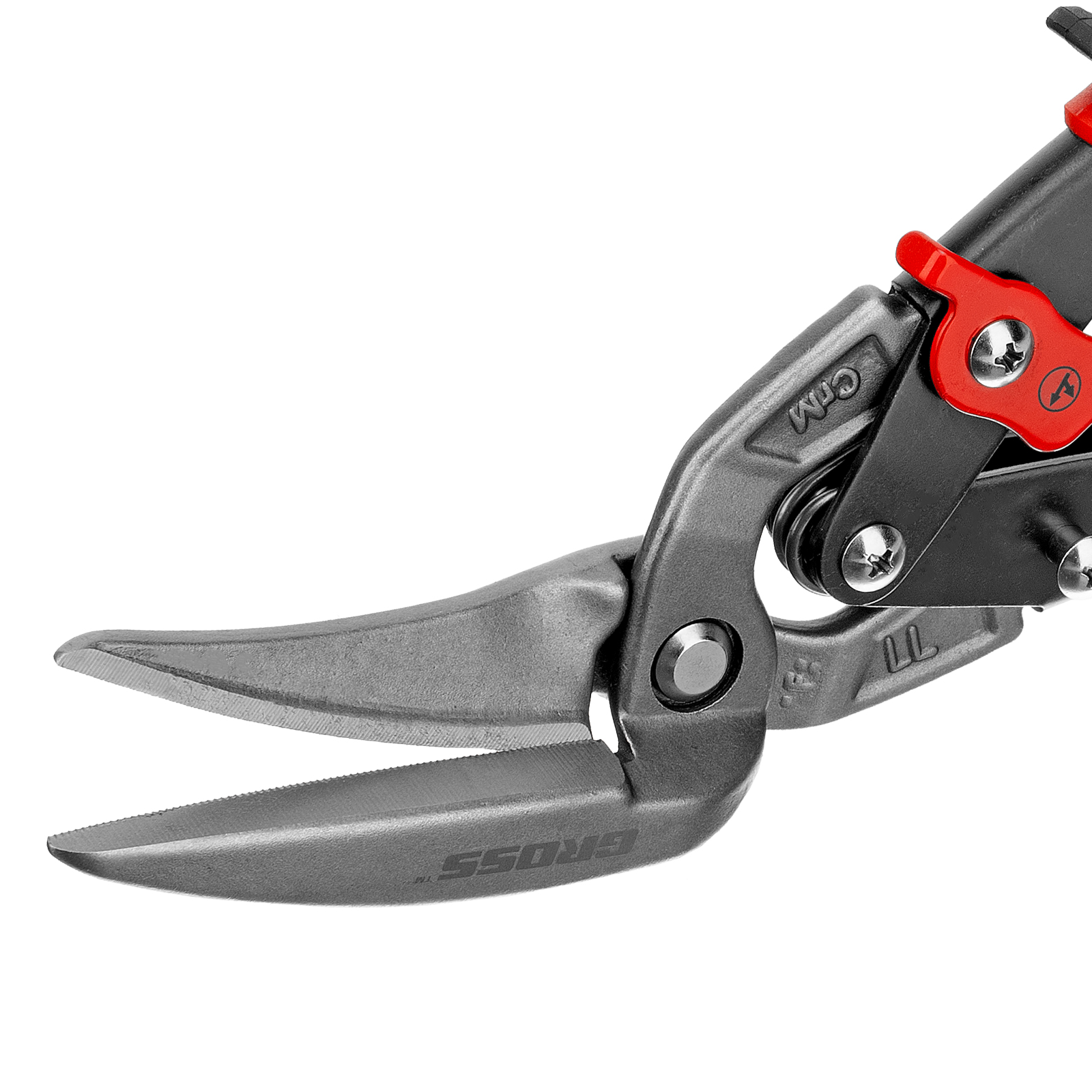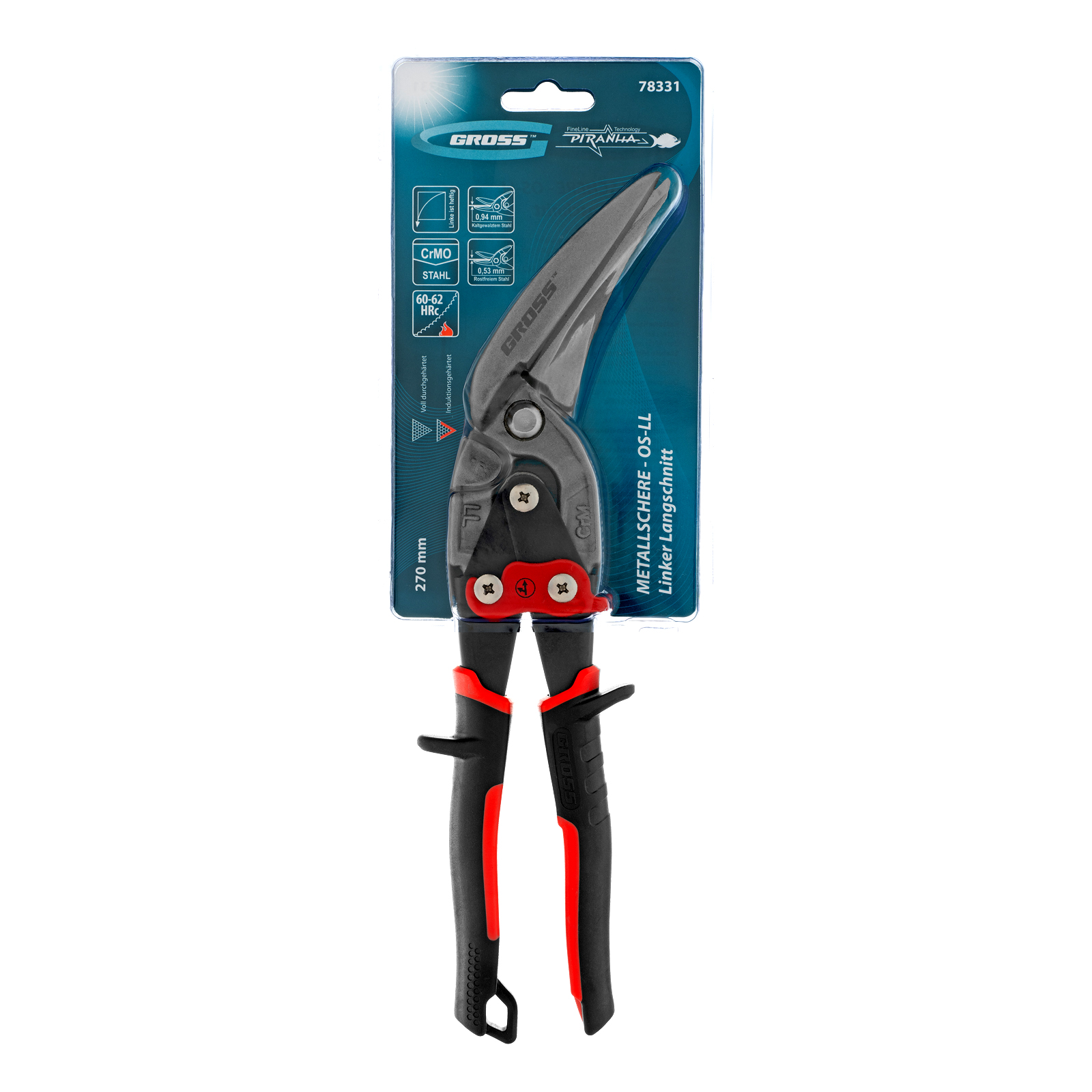 Ножницы по металлу Gross PIRANHA 78331 длиной 270 мм, из стали CrMo, с двухкомпонентными рукоятками, выполняют прямой и левый проходной рез по листовому металлу. Режут не только цветные металлы, но и стали — холоднокатаную толщиной до 0,94 мм и нержавеющую толщиной до 0,53 мм. Нагрузка на руку при этом снижается за счет двойного рычажного механизма. Ножницы рекомендованы для выполнения профессиональных слесарных работ.