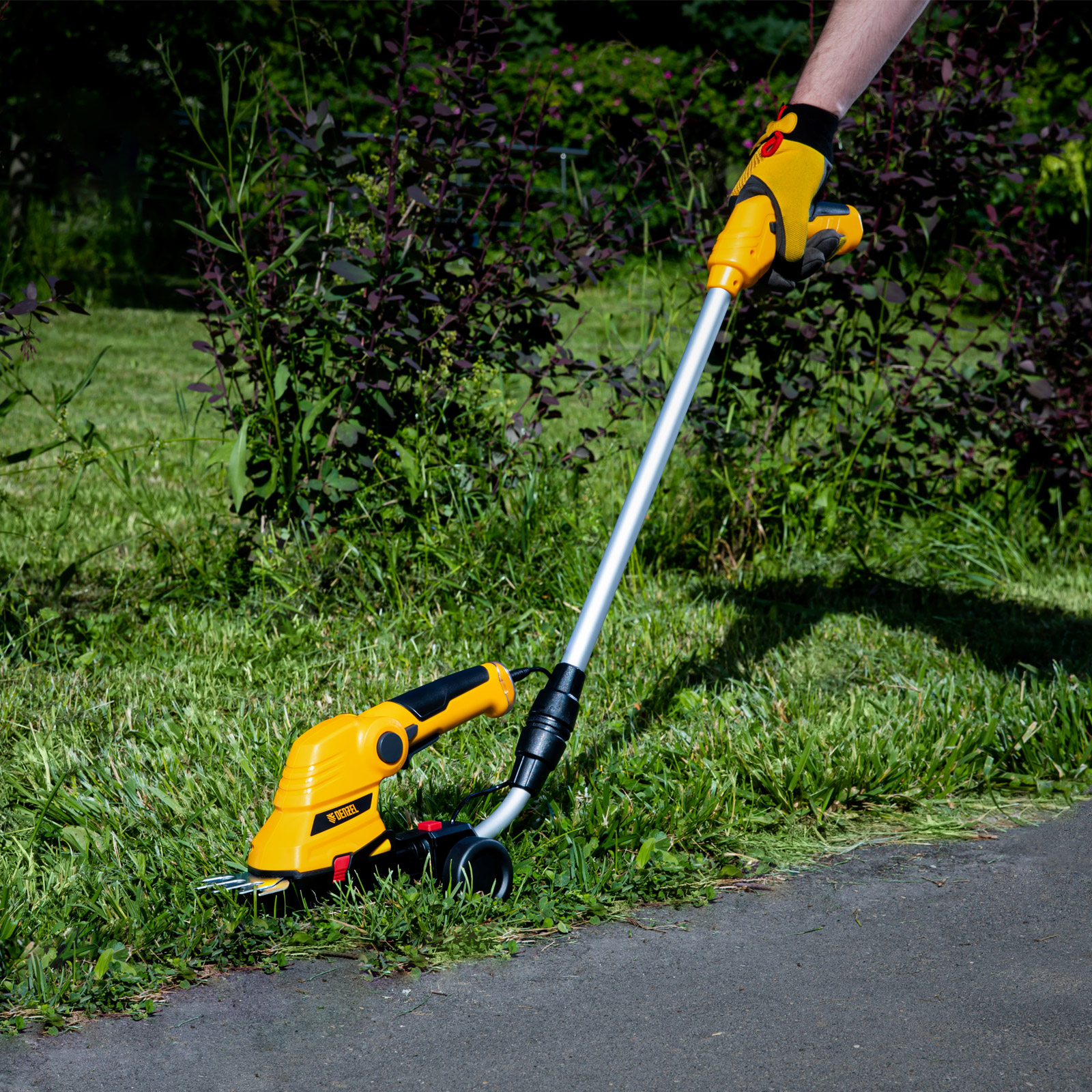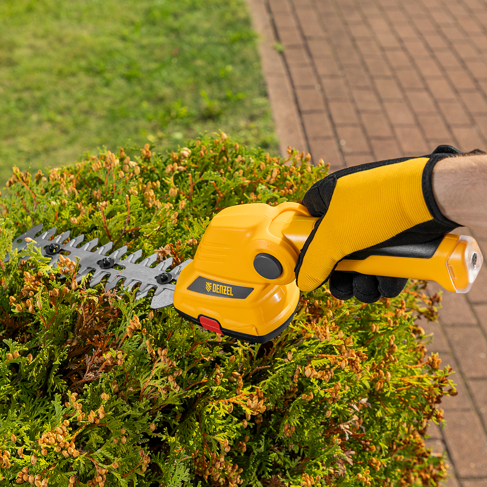 - Долговечность — медная обмотка двигателя устойчива к перегреву и обеспечивает стабильную работу ножниц-кустореза даже при высоких нагрузках.