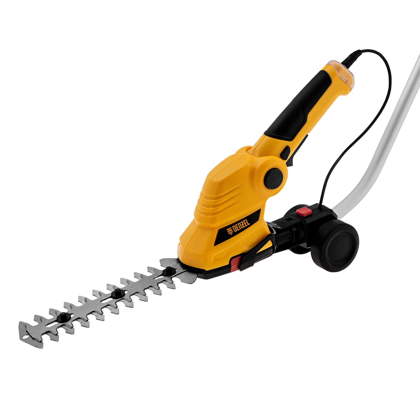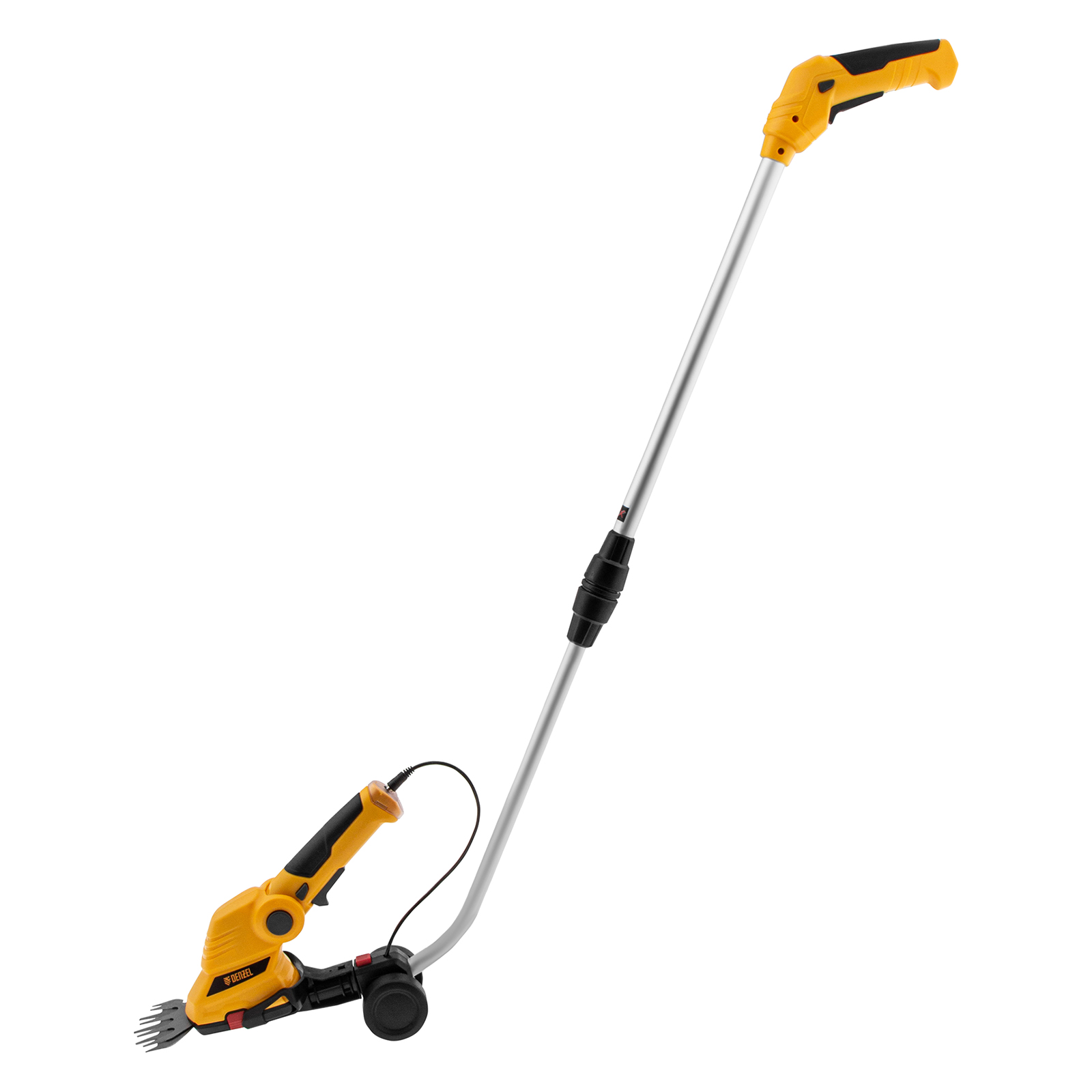 Аккумуляторные ножницы-кусторез Denzel G801E 968157 с телескопической штангой, с Li-Ion батареей емкостью 1,5 Ач и напряжением 7,2 В, используются для ухода за садовым участком. Поставляются с двумя насадками: для подрезания газонной травы и для обрезки кустов и тонких веток деревьев. Небольшой вес 1,1 кг и съемная штанга с колесным блоком обеспечивают комфортное использование ножниц-кустореза.