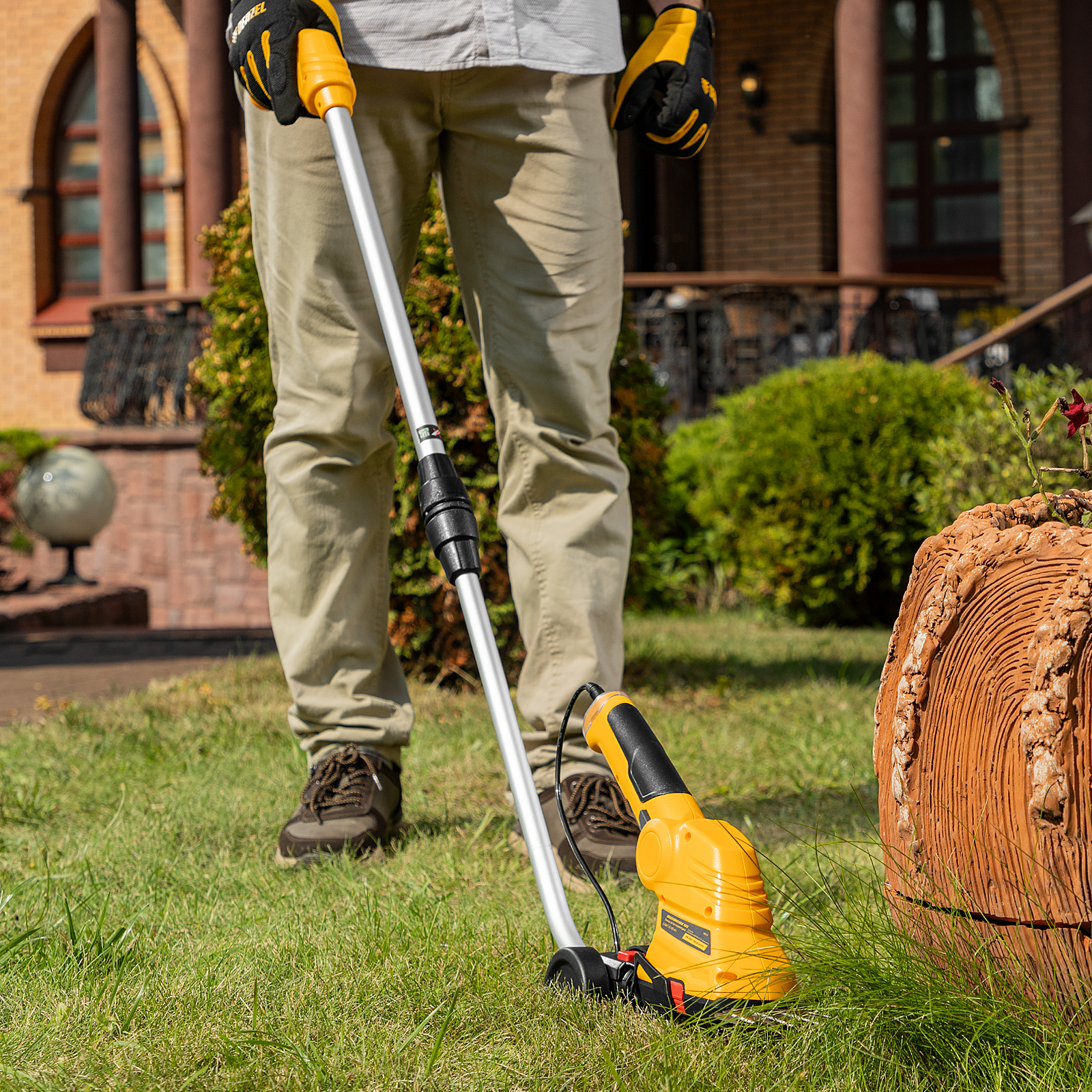 - Удобная эксплуатация — инструмент можно закрепить на телескопической штанге, регулируемой в диапазоне 800-1100 мм, что позволяет выполнять работы в труднодоступных местах.