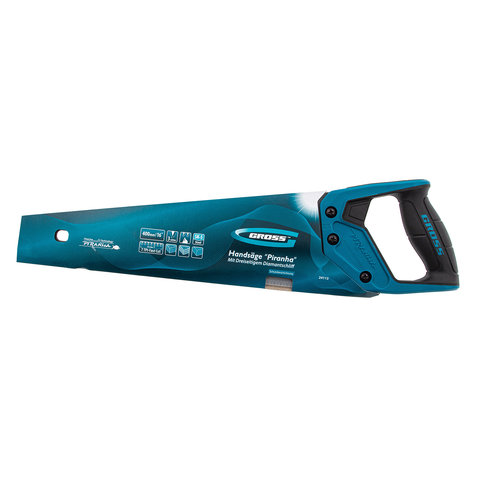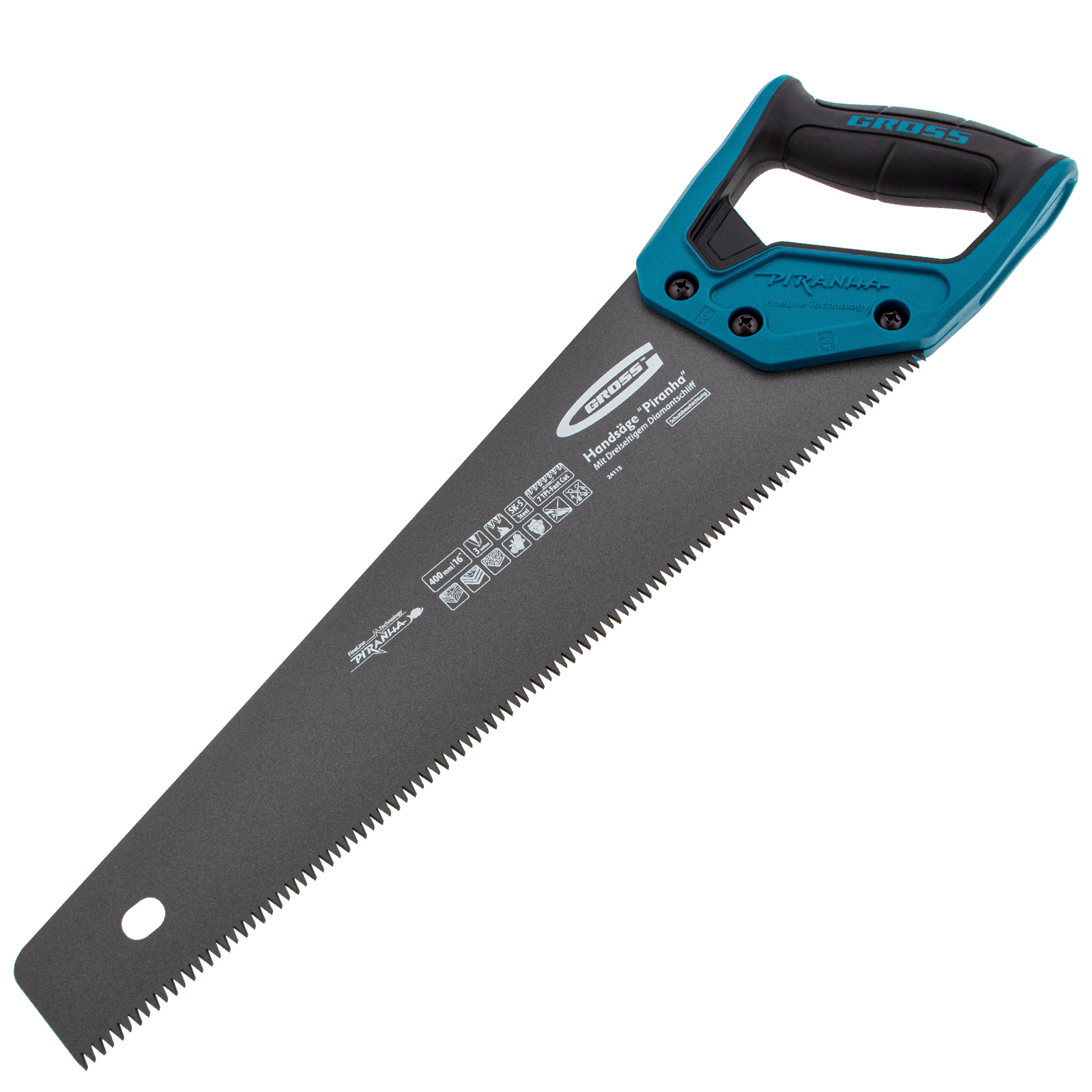 Ножовка по дереву Gross PIRANHA 24113 с полотном длиной 400 мм, калеными зубьями с 3D-заточкой и шагом 7 TPI, с тефлоновым покрытием полотна и 2-компонентной рукояткой, используется для продольного и поперечного распиливания древесины различных пород, МДФ, ДСП, ДВП, ламината, а также пенополистирола, полиуретана и других синтетических материалов. Рабочая часть состоит из крупных зубьев, поэтому ножовка подходит для решения широкого спектра задач. Трехгранная заточка зубьев увеличивает производительность инструмента без потери качества распиловки. Ножовка предназначена для столярных работ.
