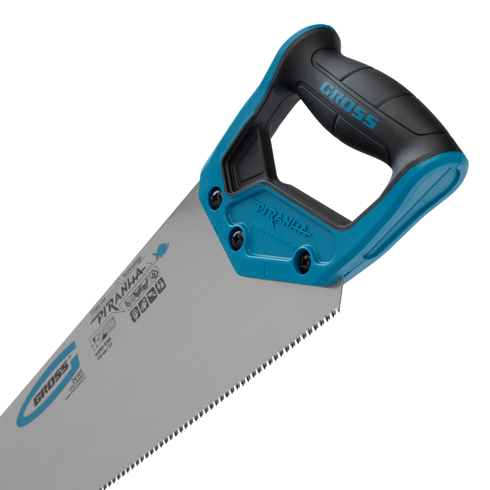 Ножовка по дереву Gross PIRANHA 24105 с полотном длиной 550 мм, калеными зубьями с 3D-заточкой и шагом 11-12 TPI, с двухкомпонентной рукояткой, предназначена для распиловки заготовок из древесины, ДСП, ДВП, МДФ и ламината, а также из пластических материалов, таких как пенополистирол и полиуретан. Может производить продольный и поперечный распил. Мелкие зубья с шагом 11-12 TPI позволяют выполнять точный и чистый рез. Ножовка обладает высокой производительностью благодаря трехгранной заточке зубьев. Инструмент используется в столярном деле.