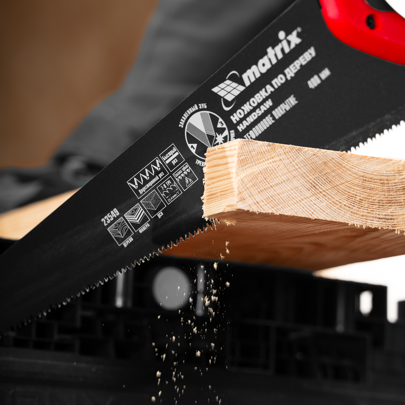 Ножовка по дереву Matrix 23549 с полотном длиной 400 мм, калеными зубьями с шагом 7-8 TPI и 3D-заточкой, с тефлоновым покрытием полотна и 2-компонентной рукояткой, пилит древесину, фанеру и ДСП. Подходит для продольного и поперечного пиления, используется для быстрой распиловки заготовок. Трехгранная заточка зубьев обеспечивает повышенную производительность. Ножовка будет полезна столяру, плотнику, пригодится также в домашнем хозяйстве.