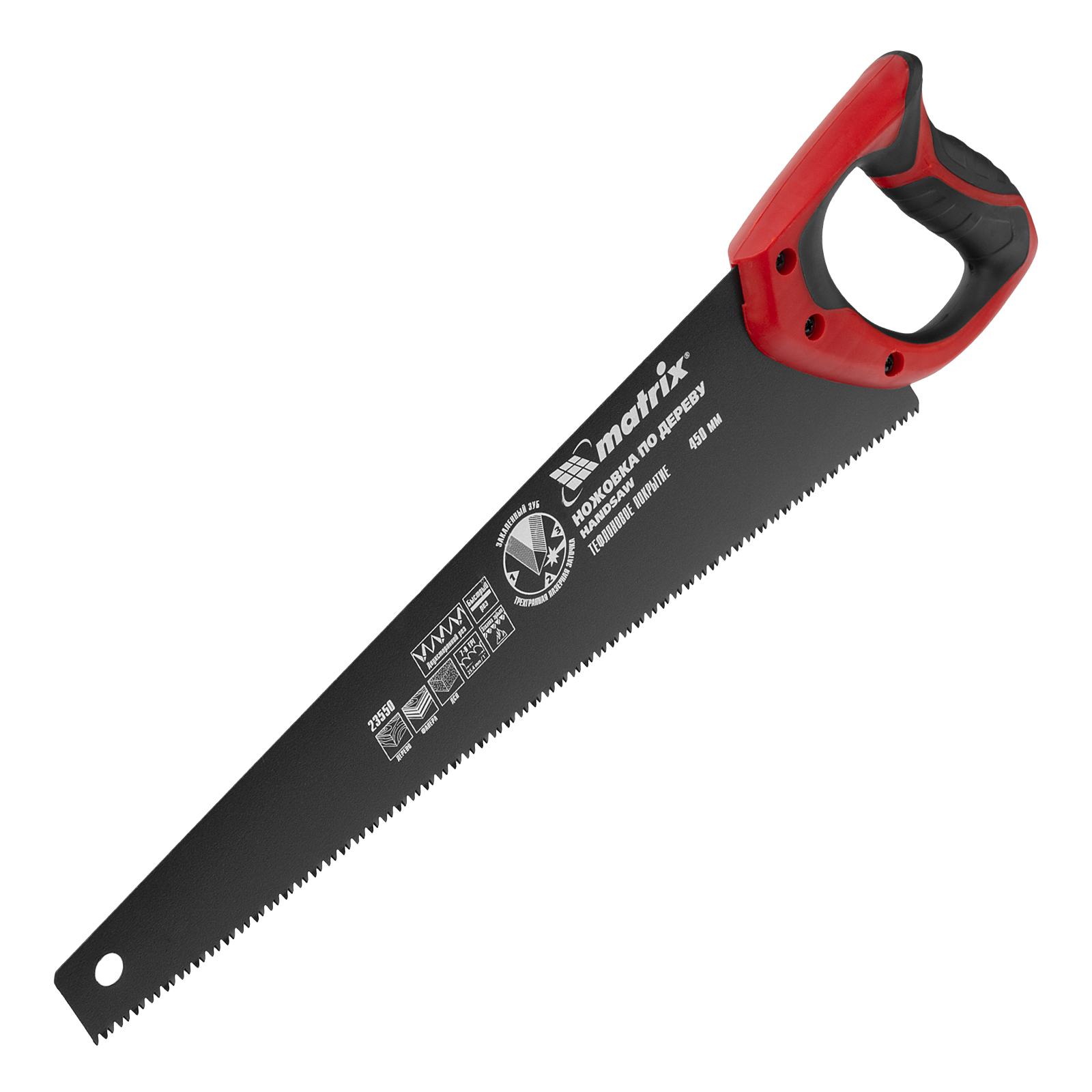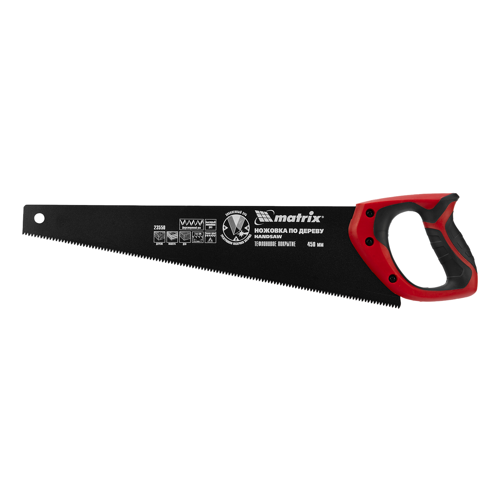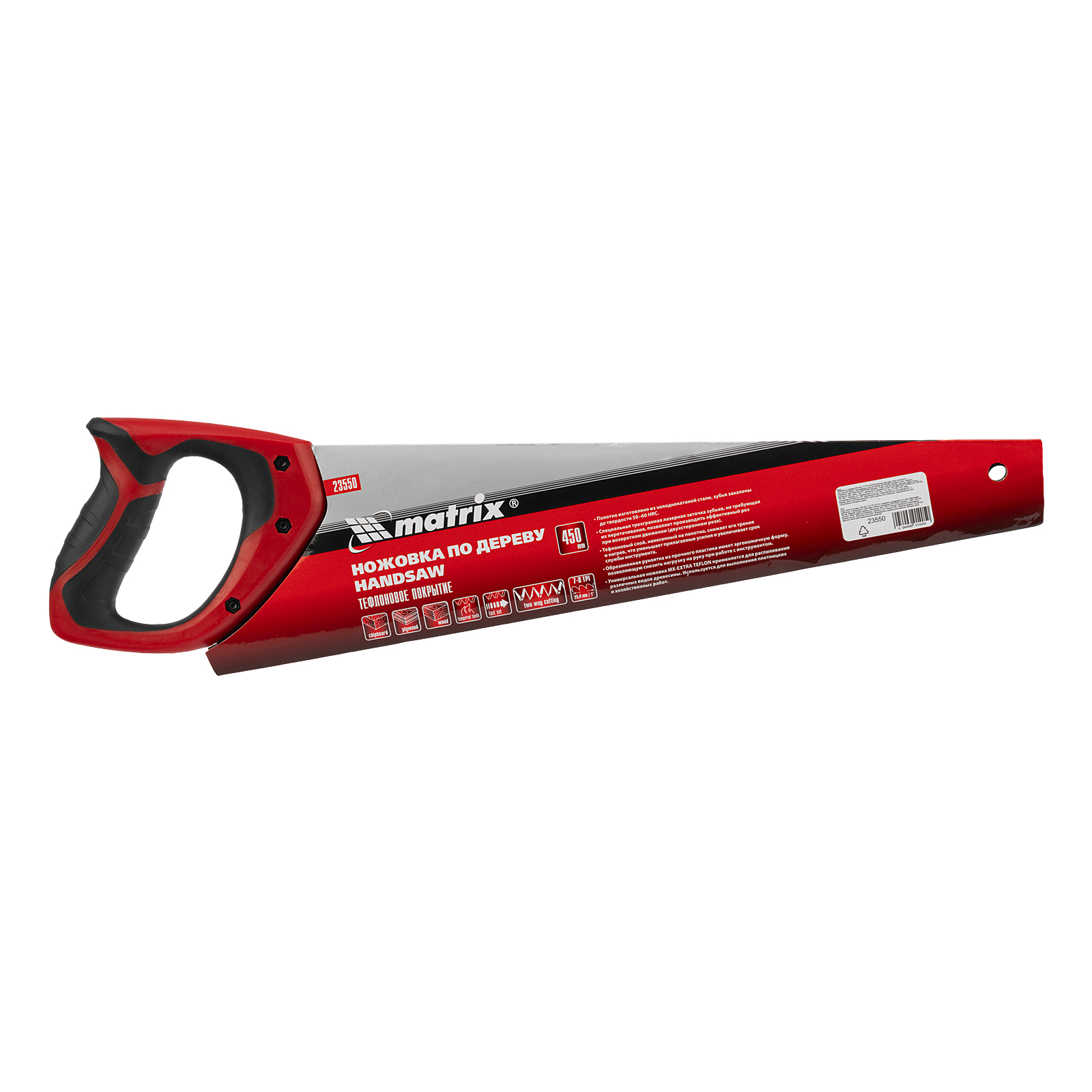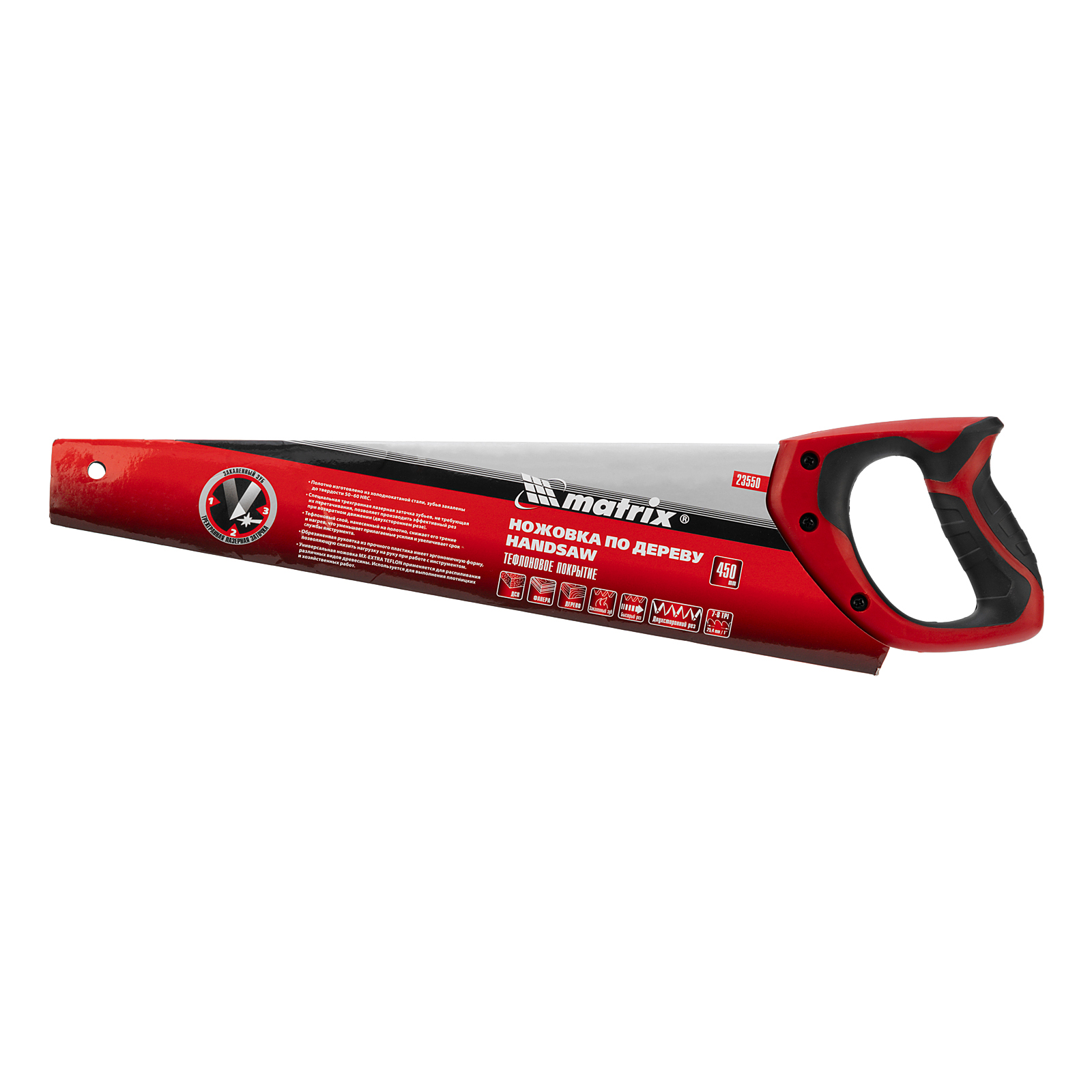 Ножовка по дереву Matrix 23550 с полотном длиной 450 мм, калеными зубьями с шагом 7-8 TPI и 3D-заточкой, с тефлоновым покрытием полотна и 2-компонентной рукояткой, предназначена для продольного и поперечного пиления древесины, фанеры и ДСП. Имеет 7-8 зубьев на дюйм, поэтому подходит для быстрой распиловки заготовок. Трехгранная заточка зубьев обеспечивает инструменту повышенную производительность. Ножовка будет полезна столяру, плотнику, а также пригодится в домашнем хозяйстве.