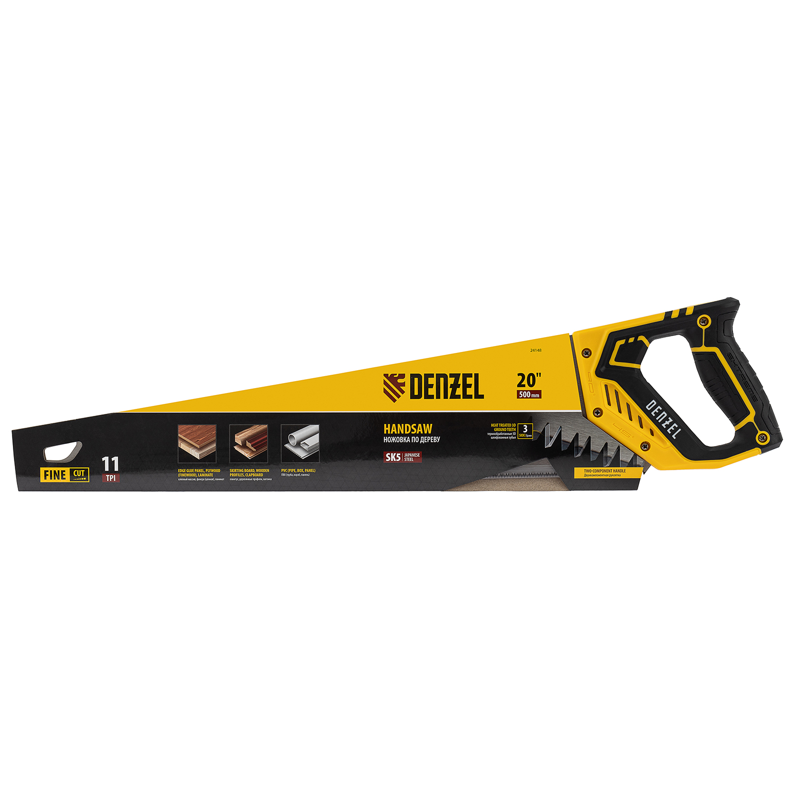 Ножовка по дереву Denzel 24148 длиной 500 мм, с зубьями с шагом 11 TPI и 3D-заточкой, с двухкомпонентной рукояткой, предназначена для продольной и поперечной распиловки заготовок из древесины, ДСП, ДВП, МДФ, ламината, а также из ПВХ (труб, панелей, коробов). Подходит для распиливания плинтусов, вагонки, деревянных профиле й. Мелкие зубья с шагом 11 TPI позволяют выполнять точный и чистый рез. Ножовка используется для проведения столярных работ в мастерской и на дачном участке.