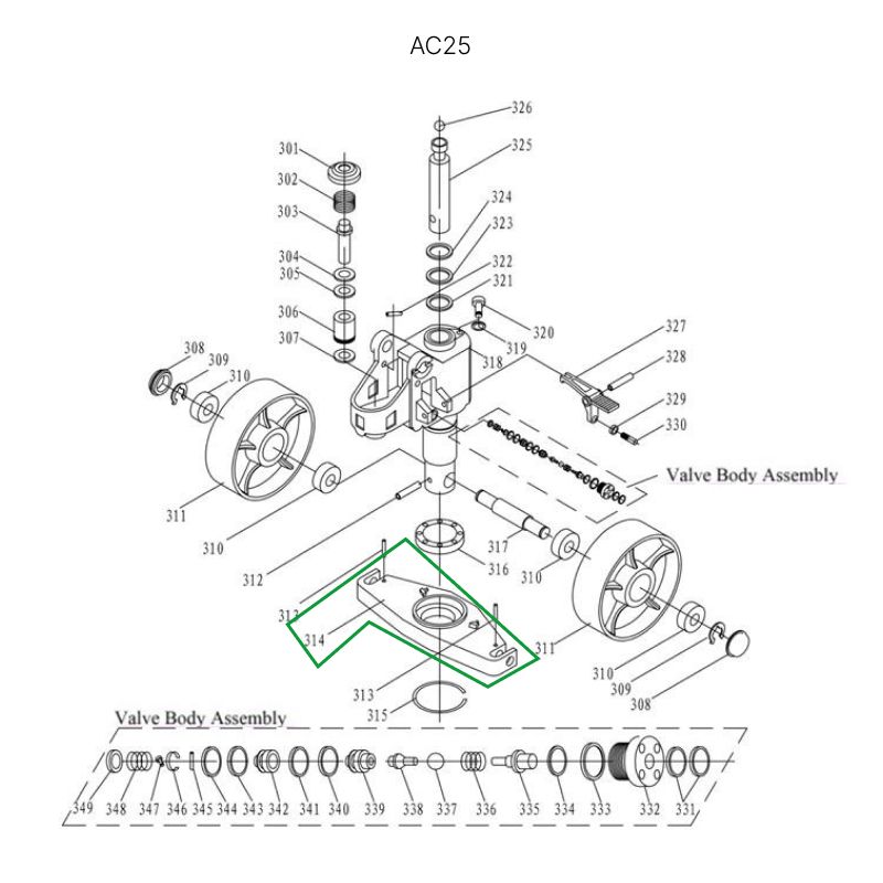 Опорная площадка гидроузла гидравлических тележек AC25. Длина 314 мм, ширина 115 мм, внешний диаметр отверстия под гидроузел 80 мм, внутренний диаметр 55 мм, диаметр в проушинах 16 мм.