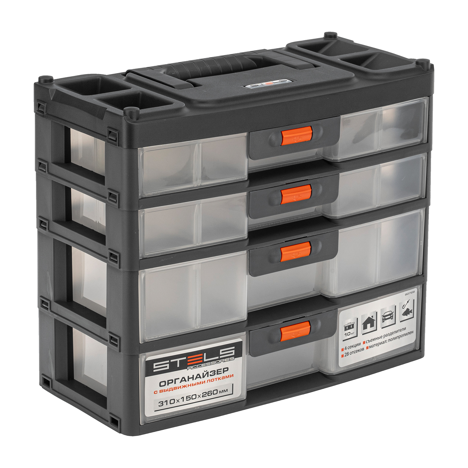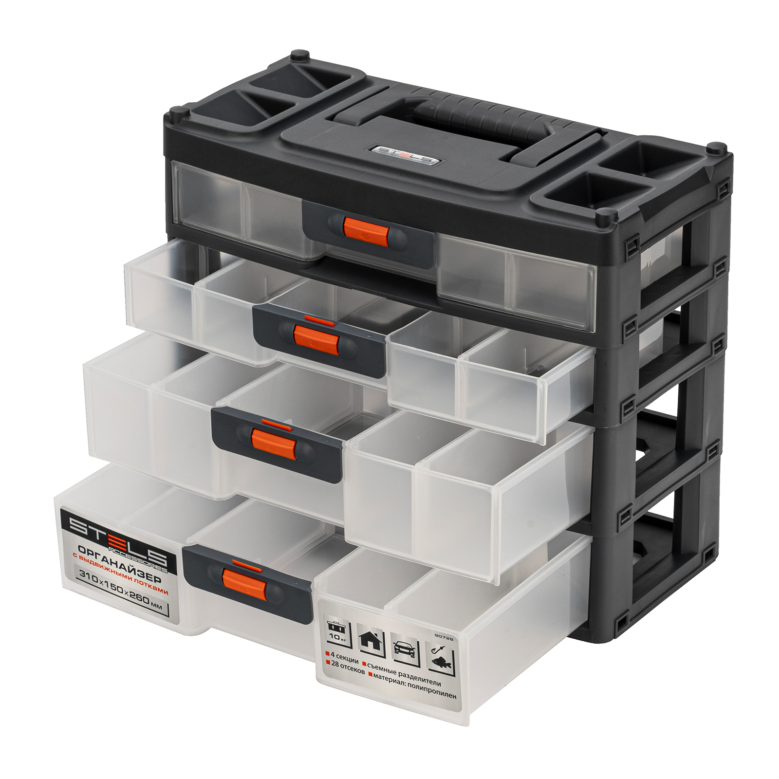 Органайзер для хранения с выдвижными лотками 310х150х260мм, 4 секции, пластик Stels в Краснодаре