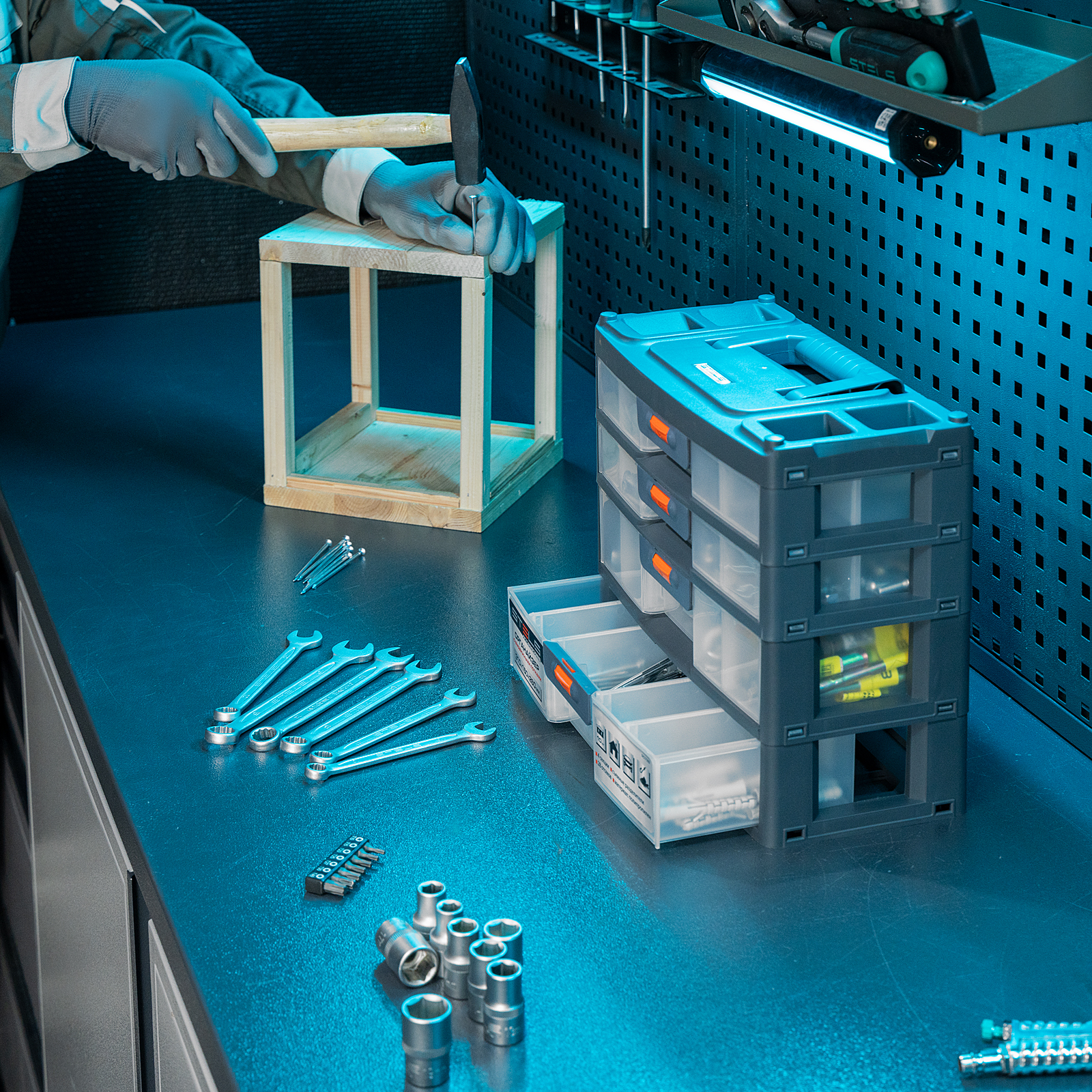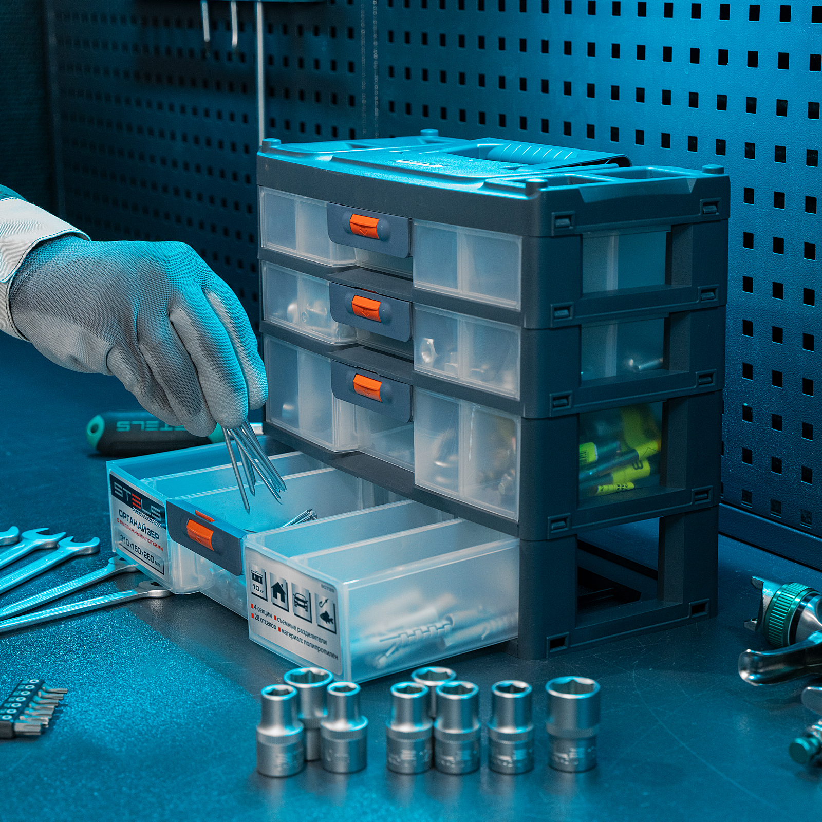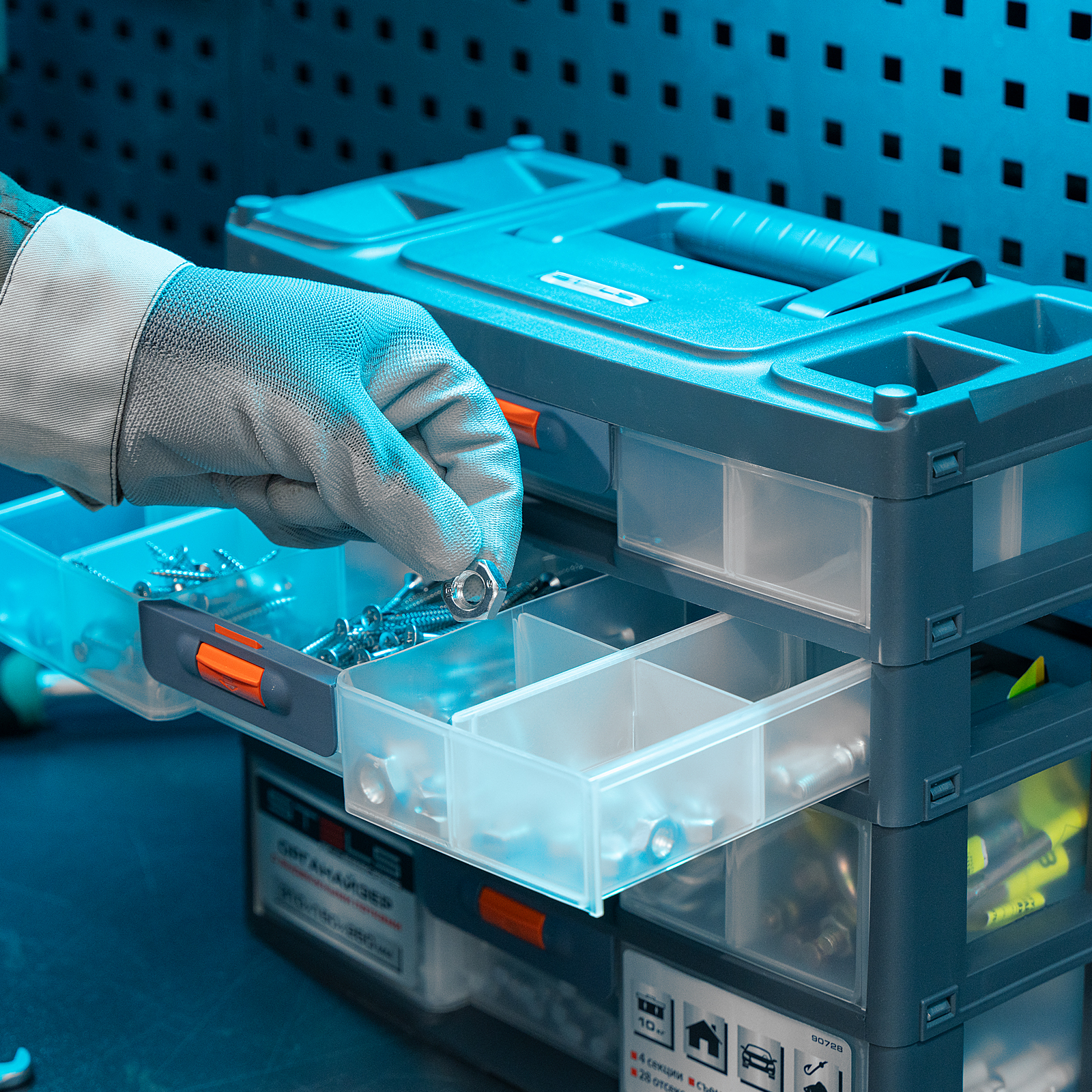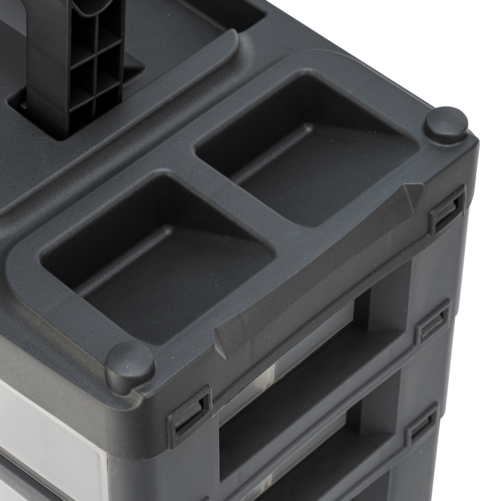 - Комфортная транспортировка — благодаря рукоятке и защелкам, предотвращающим случайное открытие, органайзер удобно перемещать.