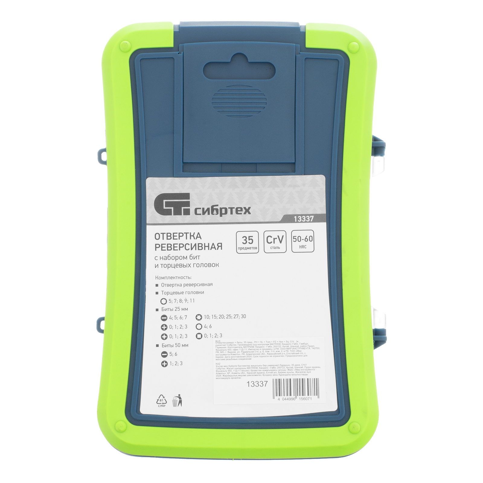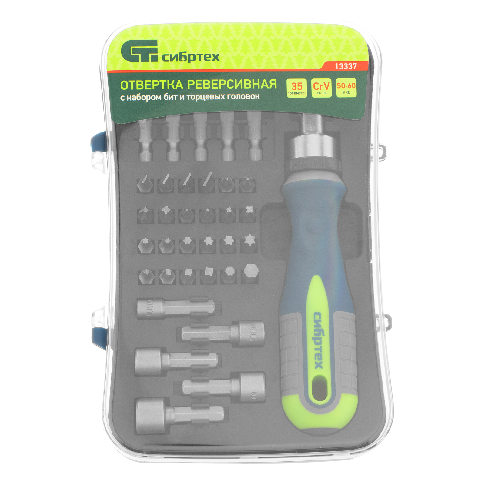 Реверсивная отвертка с набором бит и торцевыми головками Сибртех 13337, 35 инструментов, CrV, станет незаменимым помощником для частных мастеров при проведении ремонтных и монтажных работ. Удлиненные биты облегчают монтаж/демонтаж крепежных элементов в труднодоступных местах, торцевые головки позволяют работать с гайками, болтами, кровельными саморезами, имеющими внешний шестигранник и т.д.