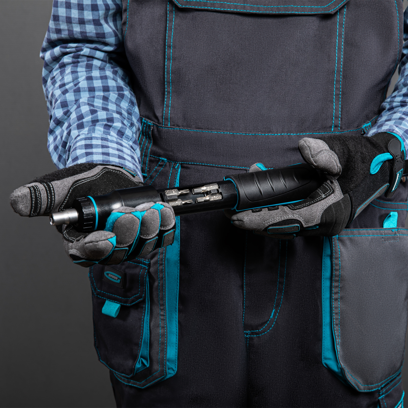 Реверсивная отвертка с револьверным механизмом Gross 11601 из стали S2, в наборе из 11 предметов, значительно повышает производительность работы при монтаже/демонтаже крепежа. За счет храпового механизма не нужно перехватывать руку или вынимать шлиц из крепежа, поэтому инструмент оптимален для профессионального использования. В качестве сменных насадок для отвертки можно применять любые биты длиной 25 мм с хвостовиком 1/4 дюйма.