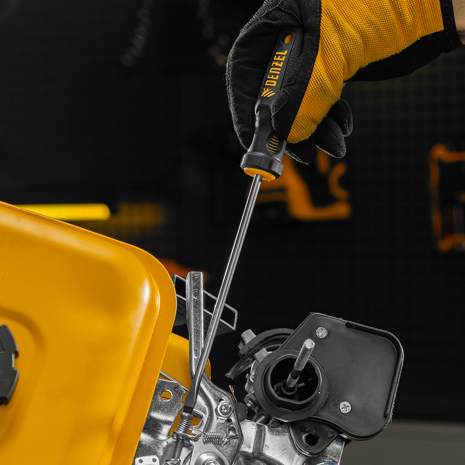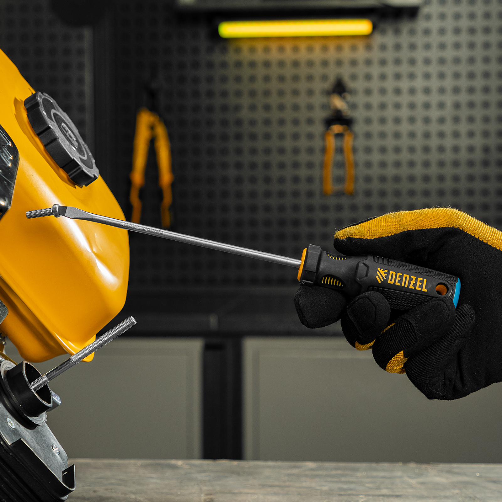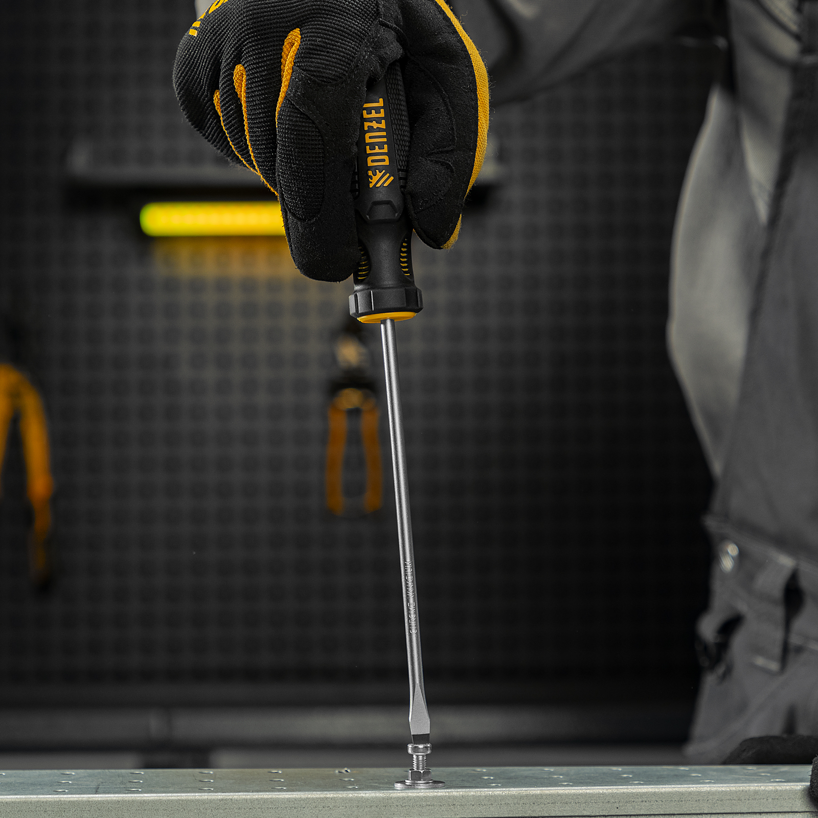 Отвертка SL5 х 150 мм Denzel 12197 из стали CrV, с трехкомпонентной рукояткой, используется для монтажа и демонтажа винтов и саморезов с прямым шлицем Slotted. Намагниченный шлиц крепко фиксируется в головке крепежа. Отвертка выдерживает интенсивное применение и предназначена для выполнения профессиональных ремонтных и монтажных работ.