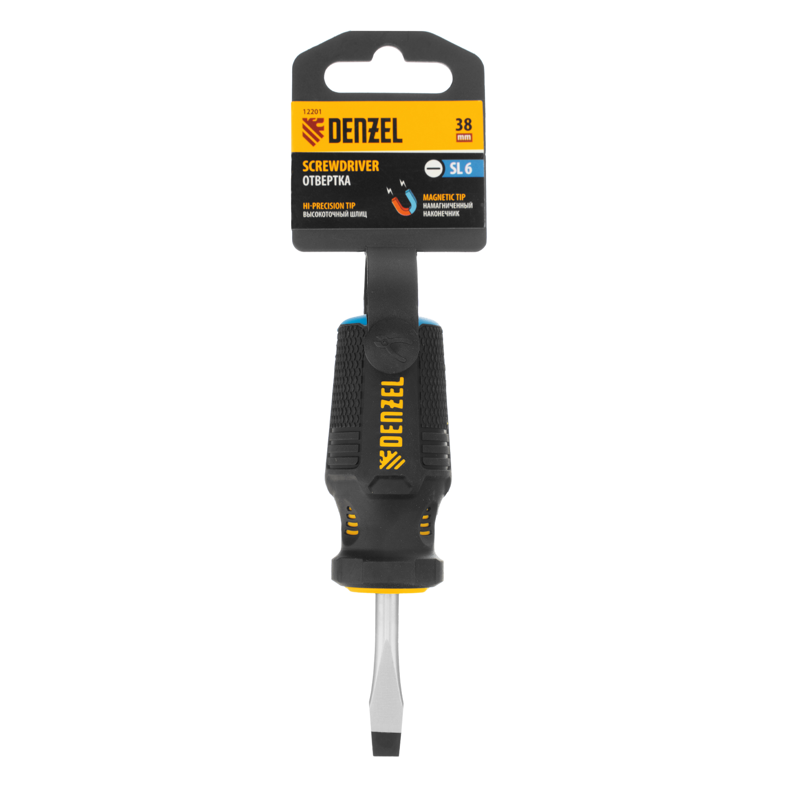 Отвертка SL6 х 38 мм Denzel 12201 из стали CrV, с трехкомпонентной рукояткой, используется для монтажа и демонтажа винтов и саморезов с прямым шлицем Slotted. Намагниченный шлиц крепко фиксируется в головке крепежа. Отвертка выдерживает интенсивное применение и предназначена для выполнения профессиональных ремонтных и монтажных работ.